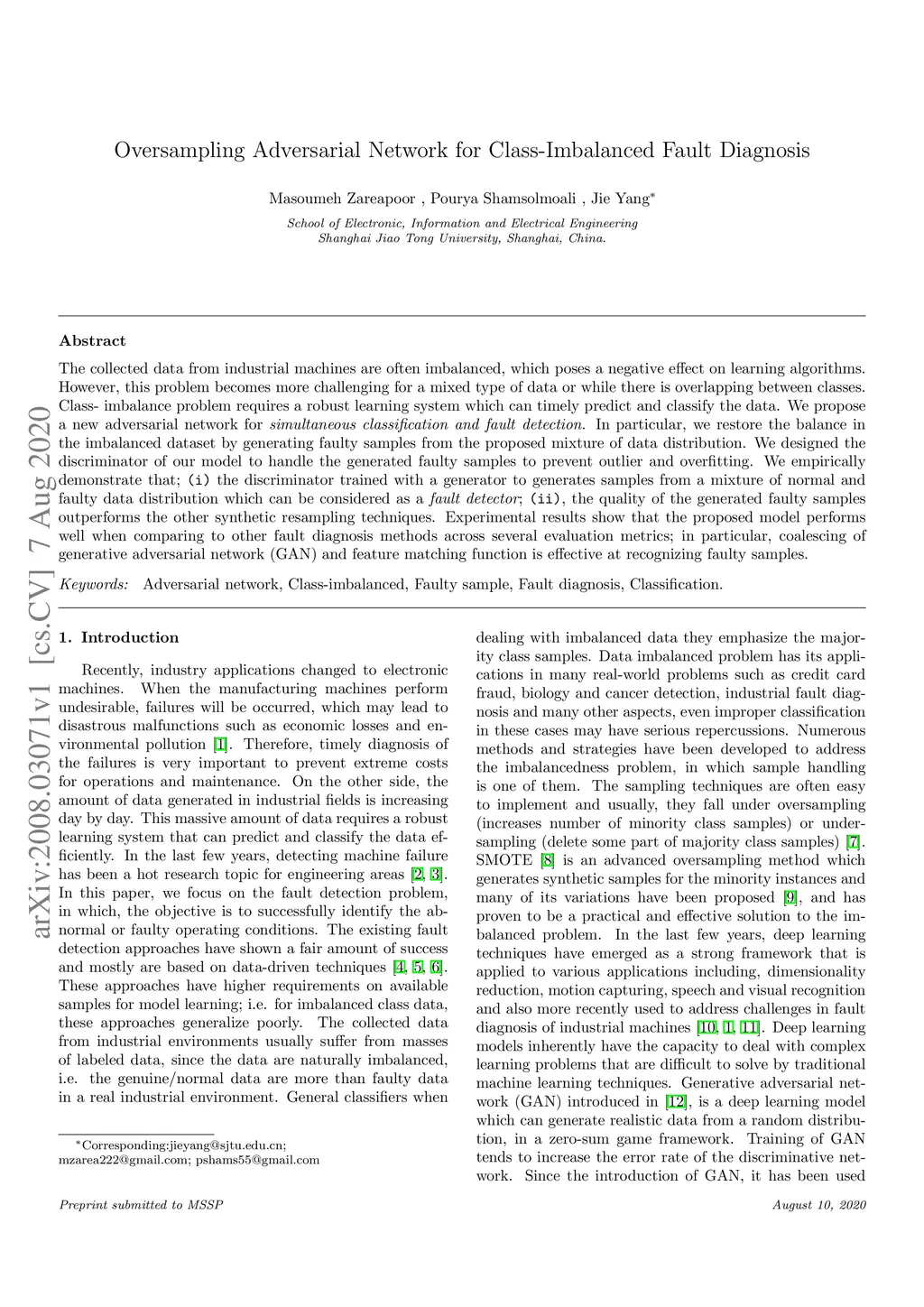 The collected data from industrial machines are often imbalanced, which poses a negative effect on learning algorithms. However, this problem becomes more challenging for a mixed type of data or while there is overlapping between classes. Class-imbalance problem requires a robust learning system which can timely predict and classify the data. We propose a new adversarial network for simultaneous classification and fault detection. In particular, we restore the balance in the imbalanced dataset by generating faulty samples from the proposed mixture of data distribution. We designed the discriminator of our model to handle the generated faulty samples to prevent outlier and overfitting. We empirically demonstrate that; (i) the discriminator trained with a generator to generates samples from a mixture of normal and faulty data distribution which can be considered as a fault detector; (ii), the quality of the generated faulty samples outperforms the other synthetic resampling techniques. Experimental results show that the proposed model performs well when comparing to other fault diagnosis methods across several evaluation metrics; in particular, coalescing of generative adversarial network (GAN) and feature matching function is effective at recognizing faulty samples.