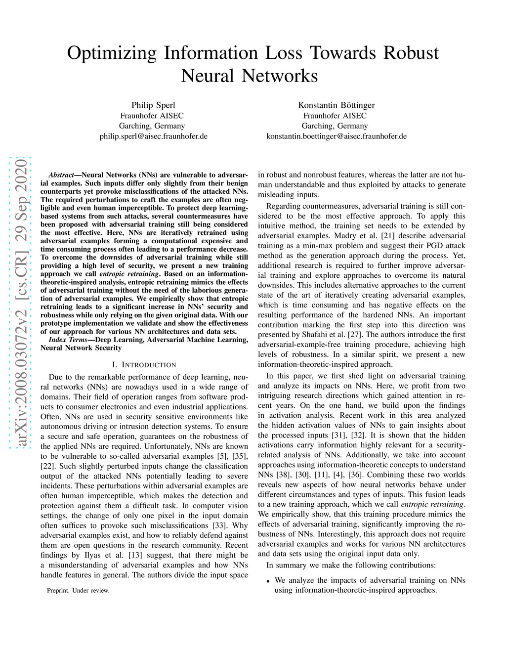 Neural Networks (NNs) are vulnerable to adversarial examples. Such inputs differ only slightly from their benign counterparts yet provoke misclassifications of the attacked NNs. The required perturbations to craft the examples are often negligible and even human imperceptible. To protect deep learning-based systems from such attacks, several countermeasures have been proposed with adversarial training still being considered the most effective. Here, NNs are iteratively retrained using adversarial examples forming a computational expensive and time consuming process often leading to a performance decrease. To overcome the downsides of adversarial training while still providing a high level of security, we present a new training approach we call \textit{entropic retraining}. Based on an information-theoretic-inspired analysis, entropic retraining mimics the effects of adversarial training without the need of the laborious generation of adversarial examples. We empirically show that entropic retraining leads to a significant increase in NNs' security and robustness while only relying on the given original data. With our prototype implementation we validate and show the effectiveness of our approach for various NN architectures and data sets.