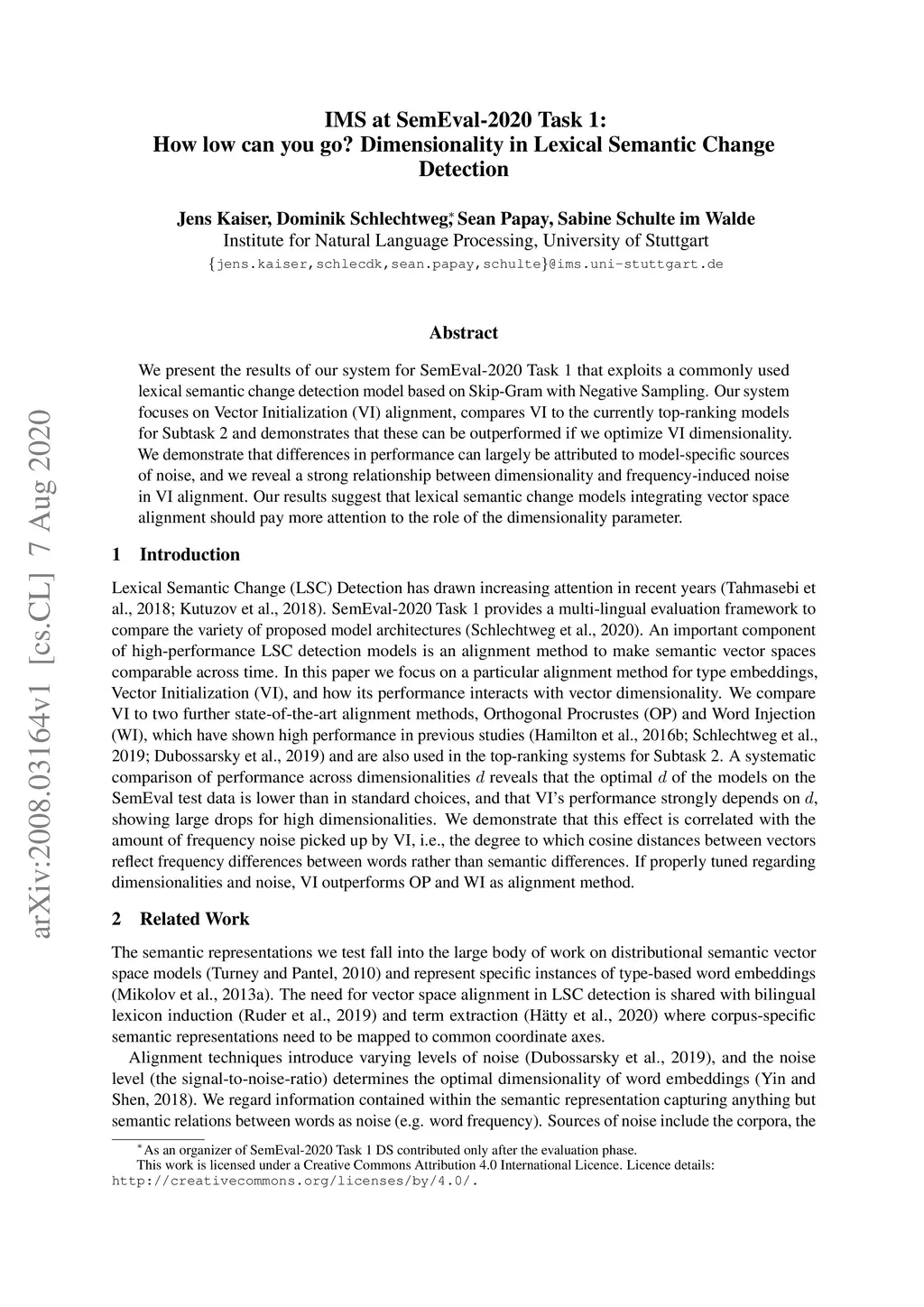 We present the results of our system for SemEval-2020 Task 1 that exploits a commonly used lexical semantic change detection model based on Skip-Gram with Negative Sampling. Our system focuses on Vector Initialization (VI) alignment, compares VI to the currently top-ranking models for Subtask 2 and demonstrates that these can be outperformed if we optimize VI dimensionality. We demonstrate that differences in performance can largely be attributed to model-specific sources of noise, and we reveal a strong relationship between dimensionality and frequency-induced noise in VI alignment. Our results suggest that lexical semantic change models integrating vector space alignment should pay more attention to the role of the dimensionality parameter.