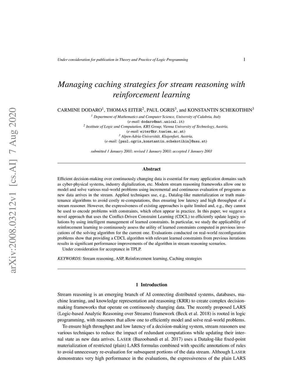 Managing caching strategies for stream reasoning with reinforcement
