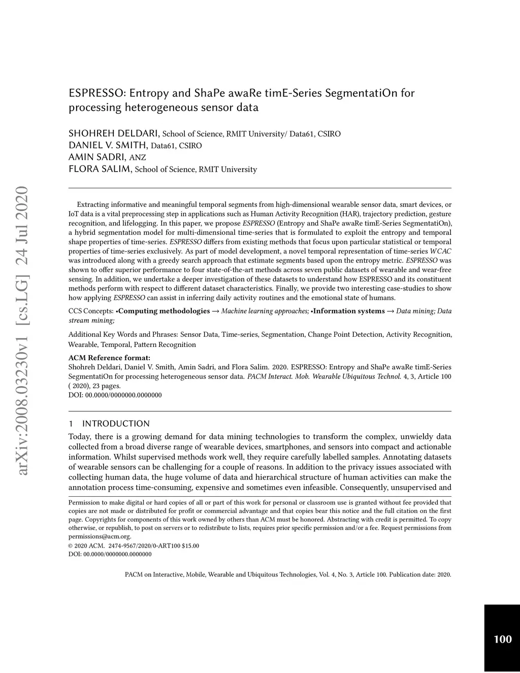 Extracting informative and meaningful temporal segments from high-dimensional wearable sensor data, smart devices, or IoT data is a vital preprocessing step in applications such as Human Activity Recognition (HAR), trajectory prediction, gesture recognition, and lifelogging. In this paper, we propose ESPRESSO (Entropy and ShaPe awaRe timE-Series SegmentatiOn), a hybrid segmentation model for multi-dimensional time-series that is formulated to exploit the entropy and temporal shape properties of time-series. ESPRESSO differs from existing methods that focus upon particular statistical or temporal properties of time-series exclusively. As part of model development, a novel temporal representation of time-series was introduced along with a greedy search approach that estimate segments based upon the entropy metric. ESPRESSO was shown to offer superior performance to four state-of-the-art methods across seven public datasets of wearable and wear-free sensing. In addition, we undertake a deeper investigation of these datasets to understand how ESPRESSO and its constituent methods perform with respect to different dataset characteristics. Finally, we provide two interesting case-studies to show how applying ESPRESSO can assist in inferring daily activity routines and the emotional state of humans.