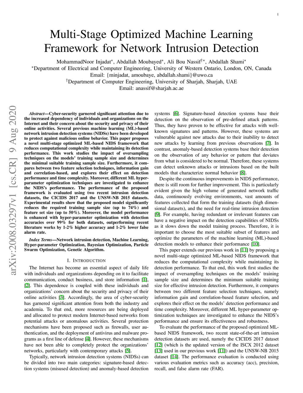 Cyber-security garnered significant attention due to the increased dependency of individuals and organizations on the Internet and their concern about the security and privacy of their online activities. Several previous machine learning (ML)-based network intrusion detection systems (NIDSs) have been developed to protect against malicious online behavior. This paper proposes a novel multi-stage optimized ML-based NIDS framework that reduces computational complexity while maintaining its detection performance. This work studies the impact of oversampling techniques on the models' training sample size and determines the minimal suitable training sample size. Furthermore, it compares between two feature selection techniques, information gain and correlation-based, and explores their effect on detection performance and time complexity. Moreover, different ML hyper-parameter optimization techniques are investigated to enhance the NIDS's performance. The performance of the proposed framework is evaluated using two recent intrusion detection datasets, the CICIDS 2017 and the UNSW-NB 2015 datasets. Experimental results show that the proposed model significantly reduces the required training sample size (up to 74%) and feature set size (up to 50%). Moreover, the model performance is enhanced with hyper-parameter optimization with detection accuracies over 99% for both datasets, outperforming recent literature works by 1-2% higher accuracy and 1-2% lower false alarm rate.