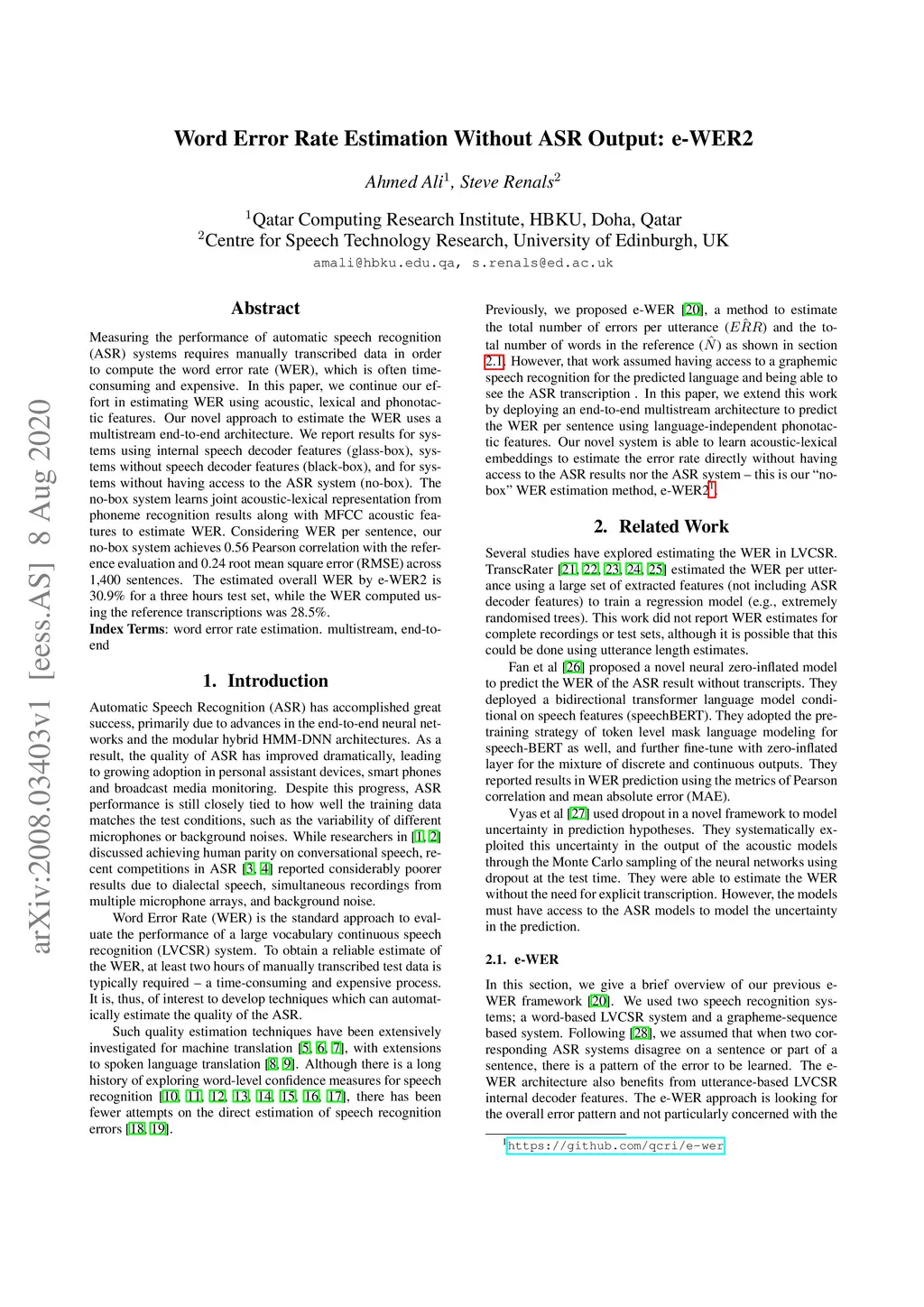 Measuring the performance of automatic speech recognition (ASR) systems requires manually transcribed data in order to compute the word error rate (WER), which is often time-consuming and expensive. In this paper, we continue our effort in estimating WER using acoustic, lexical and phonotactic features. Our novel approach to estimate the WER uses a multistream end-to-end architecture. We report results for systems using internal speech decoder features (glass-box), systems without speech decoder features (black-box), and for systems without having access to the ASR system (no-box). The no-box system learns joint acoustic-lexical representation from phoneme recognition results along with MFCC acoustic features to estimate WER. Considering WER per sentence, our no-box system achieves 0.56 Pearson correlation with the reference evaluation and 0.24 root mean square error (RMSE) across 1,400 sentences. The estimated overall WER by e-WER2 is 30.9% for a three hours test set, while the WER computed using the reference transcriptions was 28.5%.