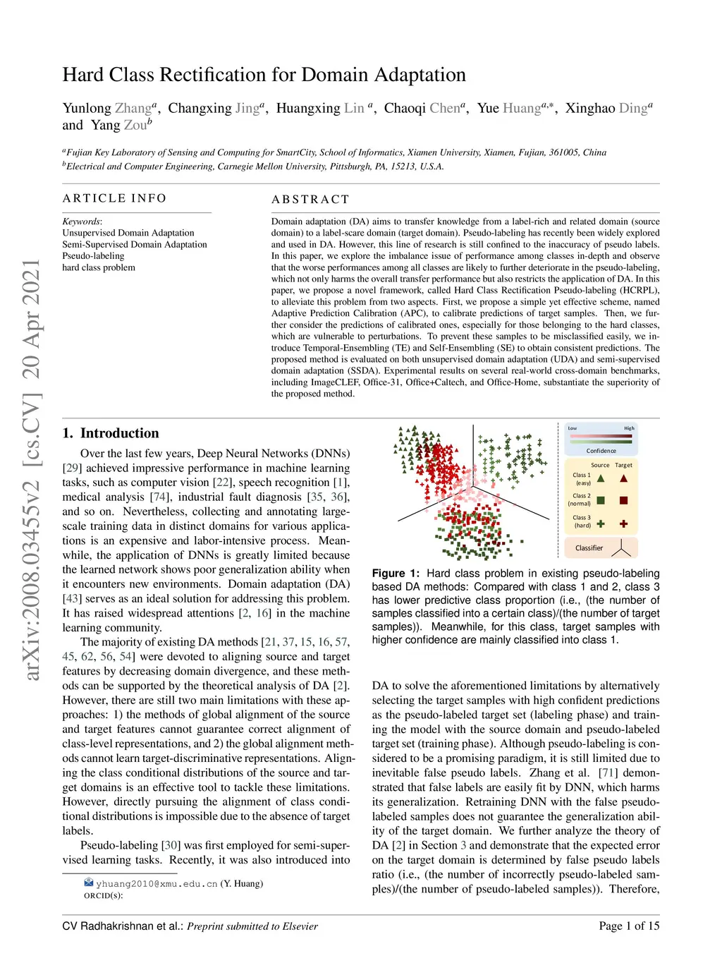 Domain adaptation (DA) aims to transfer knowledge from a label-rich and related domain (source domain) to a label-scare domain (target domain). Pseudo-labeling has recently been widely explored and used in DA. However, this line of research is still confined to the inaccuracy of pseudo-labels. In this paper, we reveal an interesting observation that the target samples belonging to the classes with larger domain shift are easier to be misclassified compared with the other classes. These classes are called hard class, which deteriorates the performance of DA and restricts the applications of DA. We propose a novel framework, called Hard Class Rectification Pseudo-labeling (HCRPL), to alleviate the hard class problem from two aspects. First, as is difficult to identify the target samples as hard class, we propose a simple yet effective scheme, named Adaptive Prediction Calibration (APC), to calibrate the predictions of the target samples according to the difficulty degree for each class. Second, we further consider that the predictions of target samples belonging to the hard class are vulnerable to perturbations. To prevent these samples to be misclassified easily, we introduce Temporal-Ensembling (TE) and Self-Ensembling (SE) to obtain consistent predictions. The proposed method is evaluated in both unsupervised domain adaptation (UDA) and semi-supervised domain adaptation (SSDA). The experimental results on several real-world cross-domain benchmarks, including ImageCLEF, Office-31 and Office-Home, substantiates the superiority of the proposed method.