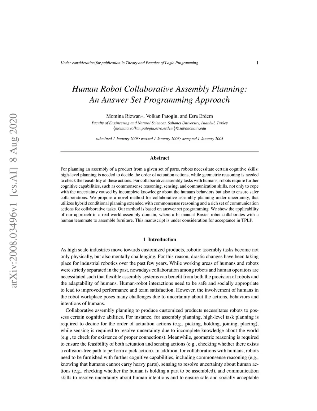 Human Robot Collaborative Assembly Planning: An Answer Set Programming