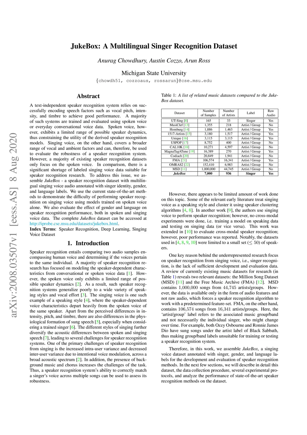 A text-independent speaker recognition system relies on successfully encoding speech factors such as vocal pitch, intensity, and timbre to achieve good performance. A majority of such systems are trained and evaluated using spoken voice or everyday conversational voice data. Spoken voice, however, exhibits a limited range of possible speaker dynamics, thus constraining the utility of the derived speaker recognition models. Singing voice, on the other hand, covers a broader range of vocal and ambient factors and can, therefore, be used to evaluate the robustness of a speaker recognition system. However, a majority of existing speaker recognition datasets only focus on the spoken voice. In comparison, there is a significant shortage of labeled singing voice data suitable for speaker recognition research. To address this issue, we assemble \textit{JukeBox} - a speaker recognition dataset with multilingual singing voice audio annotated with singer identity, gender, and language labels. We use the current state-of-the-art methods to demonstrate the difficulty of performing speaker recognition on singing voice using models trained on spoken voice alone. We also evaluate the effect of gender and language on speaker recognition performance, both in spoken and singing voice data. The complete \textit{JukeBox} dataset can be accessed at http://iprobe.cse.msu.edu/datasets/jukebox.html.