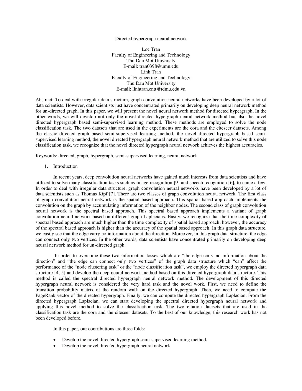 To deal with irregular data structure, graph convolution neural networks have been developed by a lot of data scientists. However, data scientists just have concentrated primarily on developing deep neural network method for un-directed graph. In this paper, we will present the novel neural network method for directed hypergraph. In the other words, we will develop not only the novel directed hypergraph neural network method but also the novel directed hypergraph based semi-supervised learning method. These methods are employed to solve the node classification task. The two datasets that are used in the experiments are the cora and the citeseer datasets. Among the classic directed graph based semi-supervised learning method, the novel directed hypergraph based semi-supervised learning method, the novel directed hypergraph neural network method that are utilized to solve this node classification task, we recognize that the novel directed hypergraph neural network achieves the highest accuracies.