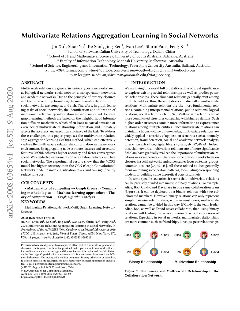 Multivariate relations are general in various types of networks, such as biological networks, social networks, transportation networks, and academic networks. Due to the principle of ternary closures and the trend of group formation, the multivariate relationships in social networks are complex and rich. Therefore, in graph learning tasks of social networks, the identification and utilization of multivariate relationship information are more important. Existing graph learning methods are based on the neighborhood information diffusion mechanism, which often leads to partial omission or even lack of multivariate relationship information, and ultimately affects the accuracy and execution efficiency of the task. To address these challenges, this paper proposes the multivariate relationship aggregation learning (MORE) method, which can effectively capture the multivariate relationship information in the network environment. By aggregating node attribute features and structural features, MORE achieves higher accuracy and faster convergence speed. We conducted experiments on one citation network and five social networks. The experimental results show that the MORE model has higher accuracy than the GCN (Graph Convolutional Network) model in node classification tasks, and can significantly reduce time cost.