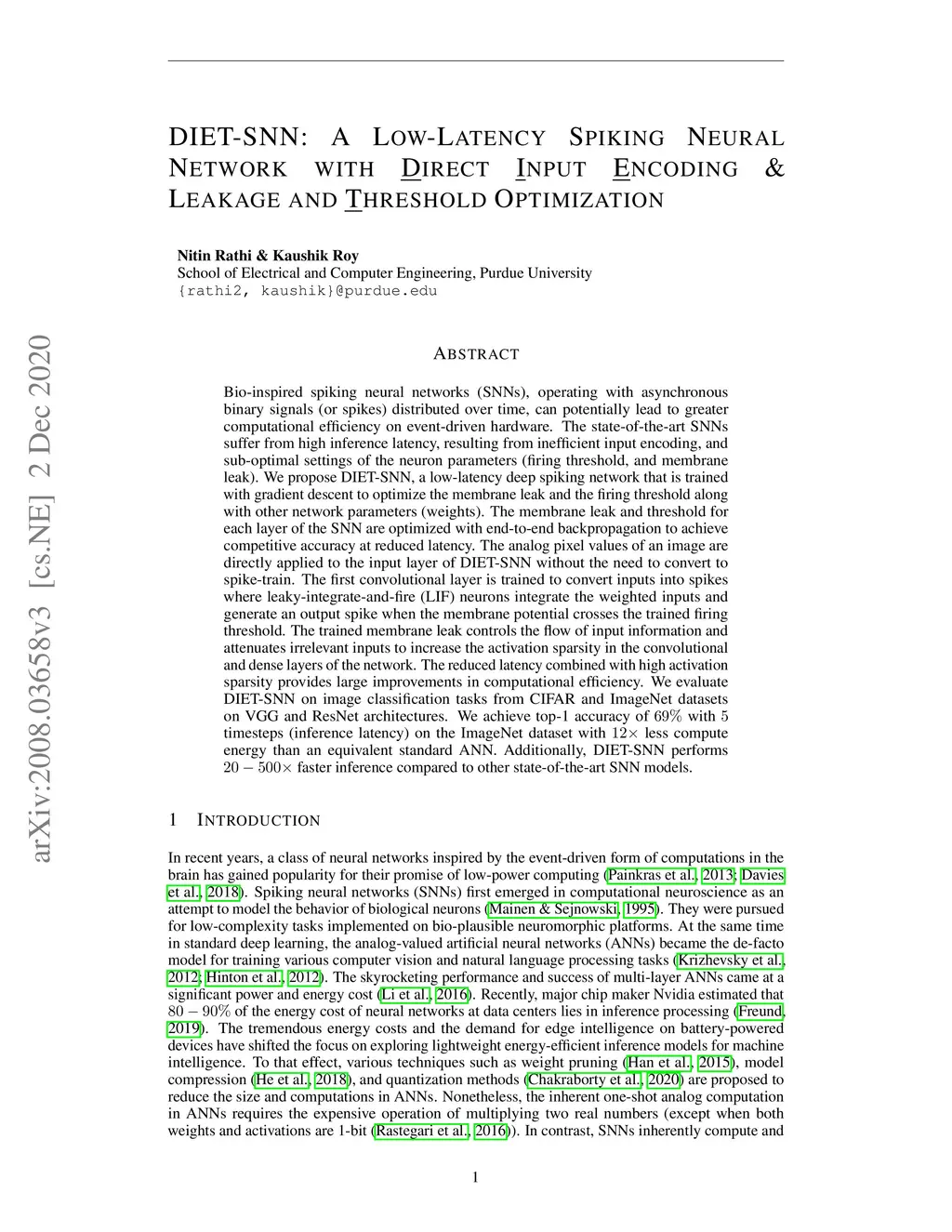 DIET-SNN: Direct Input Encoding With Leakage and Threshold Optimization