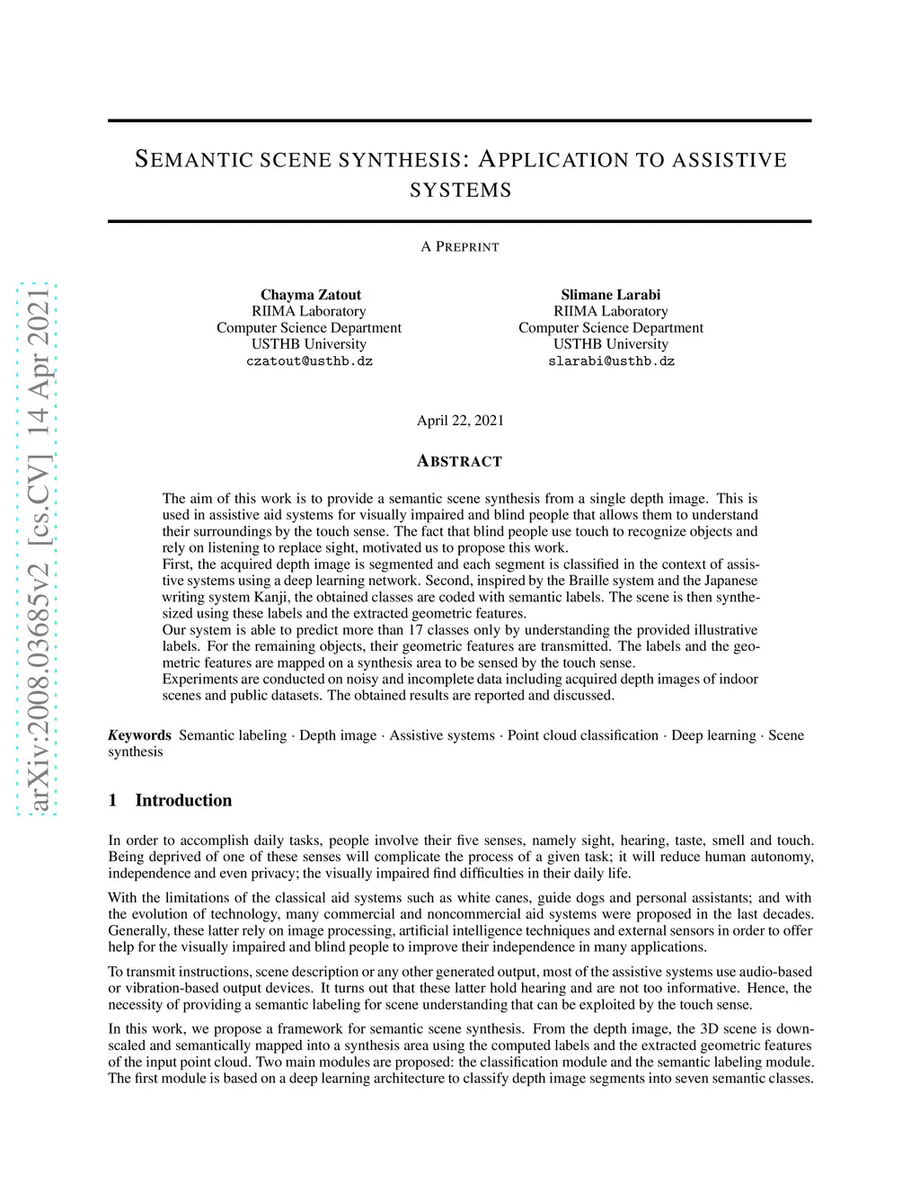 The aim of this work is to provide a semantic scene synthesis from a single depth image. This is used in assistive aid systems for visually impaired and blind people that allow them to understand their surroundings by the touch sense. The fact that blind people use touch to recognize objects and rely on listening to replace sight, motivated us to propose this work. First, the acquired depth image is segmented and each segment is classified in the context of assistive systems using a deep learning network. Second, inspired by the Braille system and the Japanese writing system Kanji, the obtained classes are coded with semantic labels. The scene is then synthesized using these labels and the extracted geometric features. Our system is able to predict more than 17 classes only by understanding the provided illustrative labels. For the remaining objects, their geometric features are transmitted. The labels and the geometric features are mapped on a synthesis area to be sensed by the touch sense. Experiments are conducted on noisy and incomplete data including acquired depth images of indoor scenes and public datasets. The obtained results are reported and discussed.