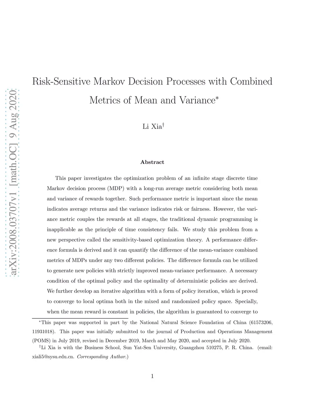 Risk-Sensitive Markov Decision Processes with Combined Metrics of Mean