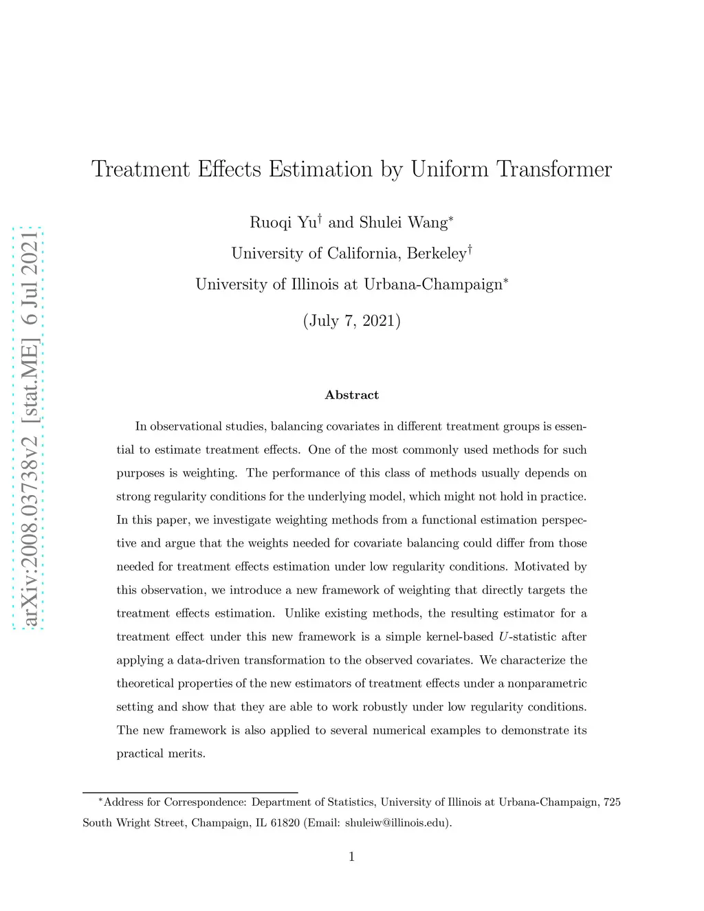 Treatment Effects Estimation by Uniform Transformer