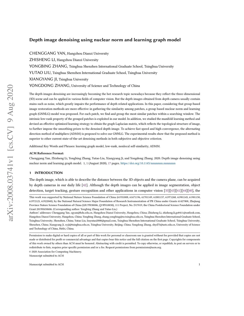 Depth image denoising using nuclear norm and learning graph model