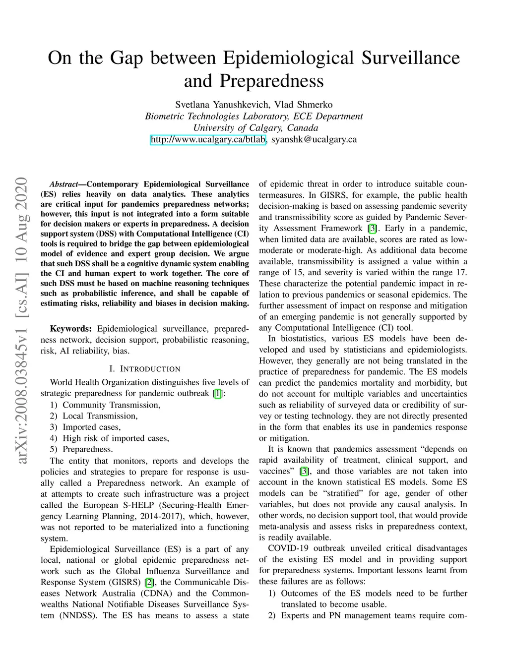 Contemporary Epidemiological Surveillance (ES) relies heavily on data analytics. These analytics are critical input for pandemics preparedness networks; however, this input is not integrated into a form suitable for decision makers or experts in preparedness. A decision support system (DSS) with Computational Intelligence (CI) tools is required to bridge the gap between epidemiological model of evidence and expert group decision. We argue that such DSS shall be a cognitive dynamic system enabling the CI and human expert to work together. The core of such DSS must be based on machine reasoning techniques such as probabilistic inference, and shall be capable of estimating risks, reliability and biases in decision making.