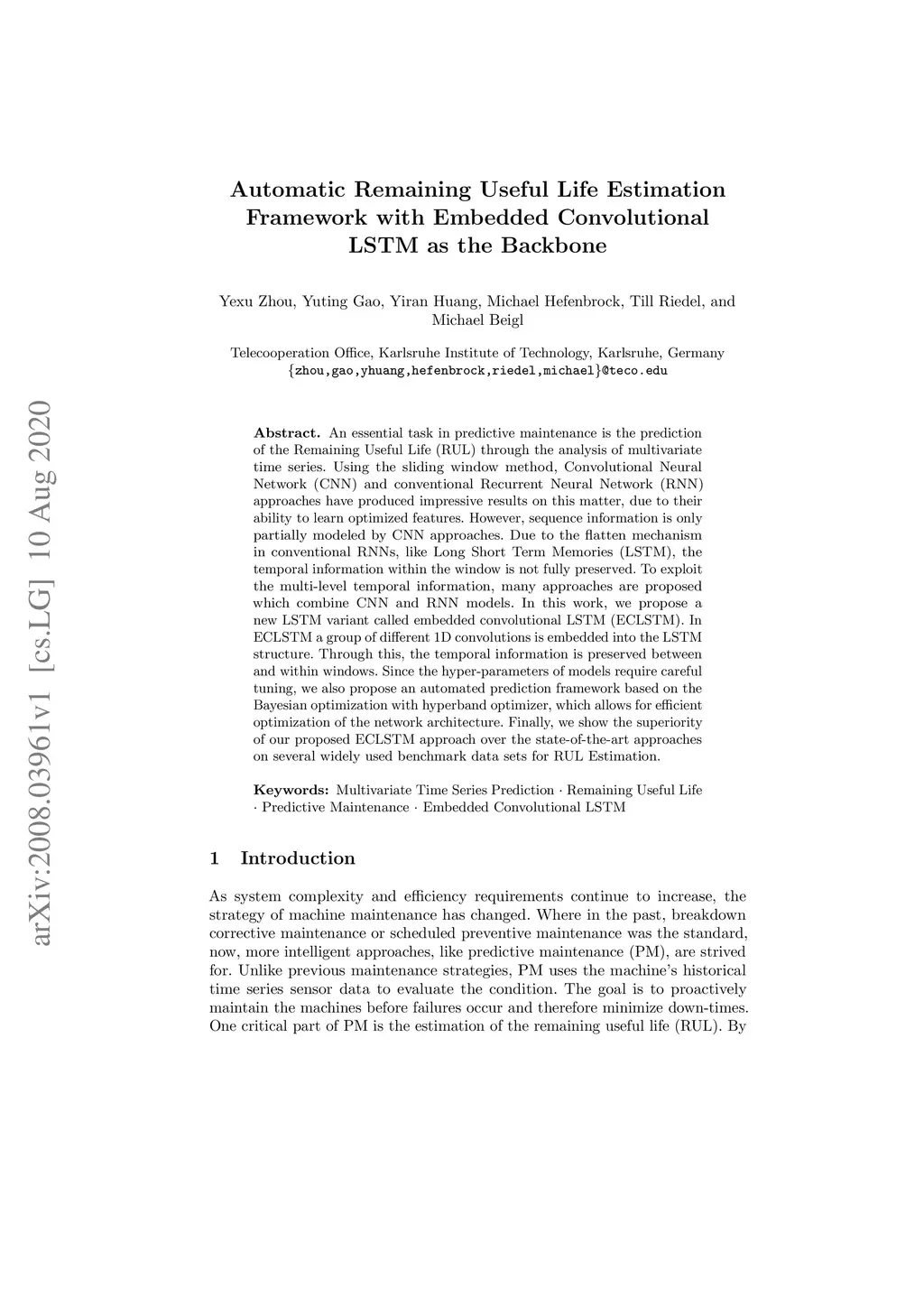 An essential task in predictive maintenance is the prediction of the Remaining Useful Life (RUL) through the analysis of multivariate time series. Using the sliding window method, Convolutional Neural Network (CNN) and conventional Recurrent Neural Network (RNN) approaches have produced impressive results on this matter, due to their ability to learn optimized features. However, sequence information is only partially modeled by CNN approaches. Due to the flatten mechanism in conventional RNNs, like Long Short Term Memories (LSTM), the temporal information within the window is not fully preserved. To exploit the multi-level temporal information, many approaches are proposed which combine CNN and RNN models. In this work, we propose a new LSTM variant called embedded convolutional LSTM (ECLSTM). In ECLSTM a group of different 1D convolutions is embedded into the LSTM structure. Through this, the temporal information is preserved between and within windows. Since the hyper-parameters of models require careful tuning, we also propose an automated prediction framework based on the Bayesian optimization with hyperband optimizer, which allows for efficient optimization of the network architecture. Finally, we show the superiority of our proposed ECLSTM approach over the state-of-the-art approaches on several widely used benchmark data sets for RUL Estimation.