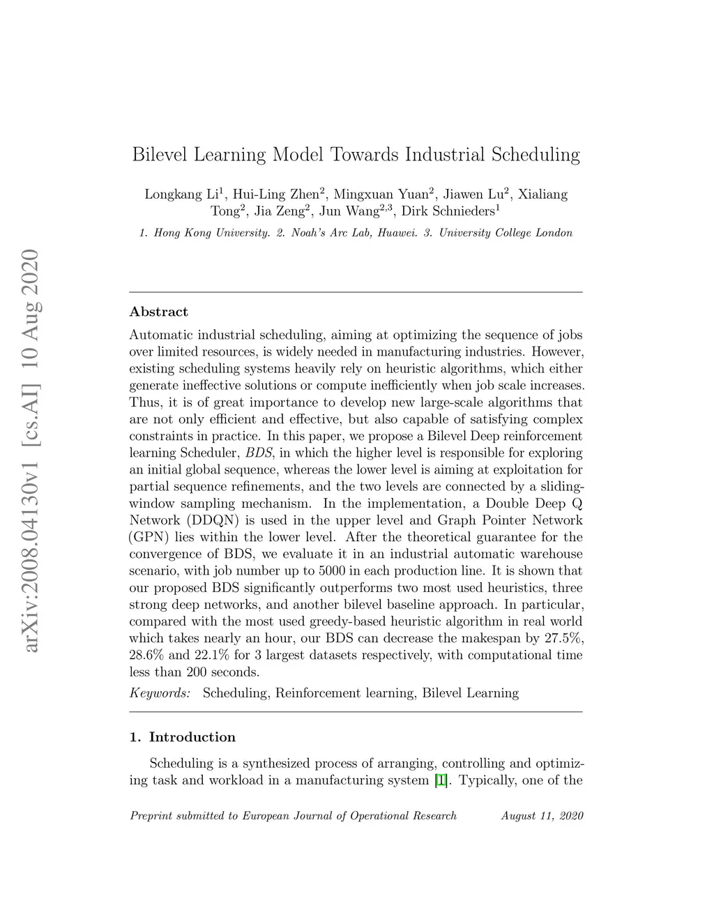 Automatic industrial scheduling, aiming at optimizing the sequence of jobs over limited resources, is widely needed in manufacturing industries. However, existing scheduling systems heavily rely on heuristic algorithms, which either generate ineffective solutions or compute inefficiently when job scale increases. Thus, it is of great importance to develop new large-scale algorithms that are not only efficient and effective, but also capable of satisfying complex constraints in practice. In this paper, we propose a Bilevel Deep reinforcement learning Scheduler, \textit{BDS}, in which the higher level is responsible for exploring an initial global sequence, whereas the lower level is aiming at exploitation for partial sequence refinements, and the two levels are connected by a sliding-window sampling mechanism. In the implementation, a Double Deep Q Network (DDQN) is used in the upper level and Graph Pointer Network (GPN) lies within the lower level. After the theoretical guarantee for the convergence of BDS, we evaluate it in an industrial automatic warehouse scenario, with job number up to in each production line. It is shown that our proposed BDS significantly outperforms two most used heuristics, three strong deep networks, and another bilevel baseline approach. In particular, compared with the most used greedy-based heuristic algorithm in real world which takes nearly an hour, our BDS can decrease the makespan by 27.5\%, 28.6\% and 22.1\% for 3 largest datasets respectively, with computational time less than 200 seconds.