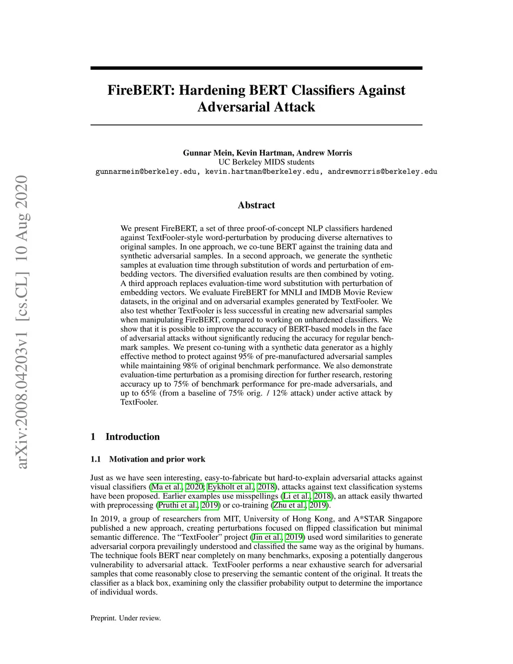 We present FireBERT, a set of three proof-of-concept NLP classifiers hardened against TextFooler-style word-perturbation by producing diverse alternatives to original samples. In one approach, we co-tune BERT against the training data and synthetic adversarial samples. In a second approach, we generate the synthetic samples at evaluation time through substitution of words and perturbation of embedding vectors. The diversified evaluation results are then combined by voting. A third approach replaces evaluation-time word substitution with perturbation of embedding vectors. We evaluate FireBERT for MNLI and IMDB Movie Review datasets, in the original and on adversarial examples generated by TextFooler. We also test whether TextFooler is less successful in creating new adversarial samples when manipulating FireBERT, compared to working on unhardened classifiers. We show that it is possible to improve the accuracy of BERT-based models in the face of adversarial attacks without significantly reducing the accuracy for regular benchmark samples. We present co-tuning with a synthetic data generator as a highly effective method to protect against 95% of pre-manufactured adversarial samples while maintaining 98% of original benchmark performance. We also demonstrate evaluation-time perturbation as a promising direction for further research, restoring accuracy up to 75% of benchmark performance for pre-made adversarials, and up to 65% (from a baseline of 75% orig. / 12% attack) under active attack by TextFooler.