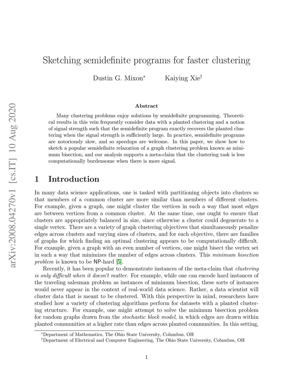 Many clustering problems enjoy solutions by semidefinite programming. Theoretical results in this vein frequently consider data with a planted clustering and a notion of signal strength such that the semidefinite program exactly recovers the planted clustering when the signal strength is sufficiently large. In practice, semidefinite programs are notoriously slow, and so speedups are welcome. In this paper, we show how to sketch a popular semidefinite relaxation of a graph clustering problem known as minimum bisection, and our analysis supports a meta-claim that the clustering task is less computationally burdensome when there is more signal.