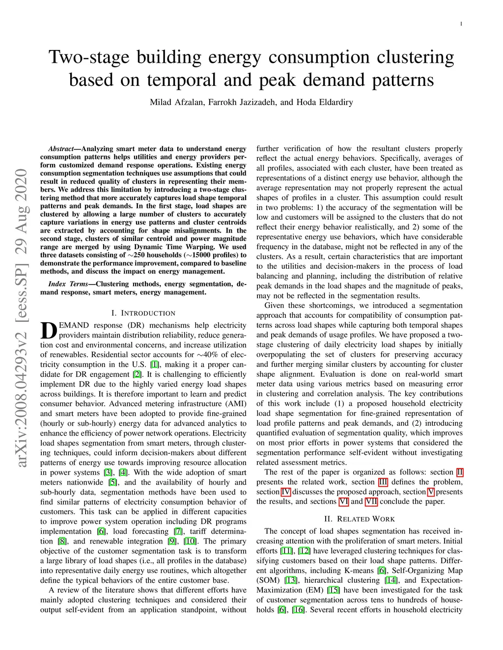 Analyzing smart meter data to understand energy consumption patterns helps utilities and energy providers perform customized demand response operations. Existing energy consumption segmentation techniques use assumptions that could result in reduced quality of clusters in representing their members. We address this limitation by introducing a two-stage clustering method that more accurately captures load shape temporal patterns and peak demands. In the first stage, load shapes are clustered by allowing a large number of clusters to accurately capture variations in energy use patterns and cluster centroids are extracted by accounting for shape misalignments. In the second stage, clusters of similar centroid and power magnitude range are merged by using Dynamic Time Warping. We used three datasets consisting of ~250 households (~15000 profiles) to demonstrate the performance improvement, compared to baseline methods, and discuss the impact on energy management.