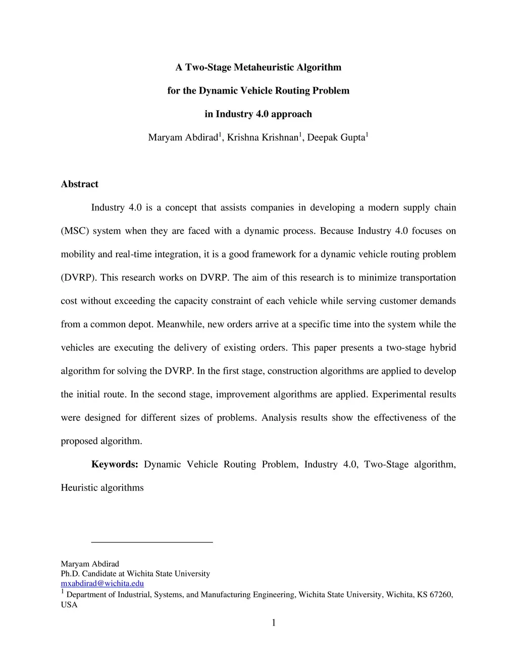Industry 4.0 is a concept that assists companies in developing a modern supply chain (MSC) system when they are faced with a dynamic process. Because Industry 4.0 focuses on mobility and real-time integration, it is a good framework for a dynamic vehicle routing problem (DVRP). This research works on DVRP. The aim of this research is to minimize transportation cost without exceeding the capacity constraint of each vehicle while serving customer demands from a common depot. Meanwhile, new orders arrive at a specific time into the system while the vehicles are executing the delivery of existing orders. This paper presents a two-stage hybrid algorithm for solving the DVRP. In the first stage, construction algorithms are applied to develop the initial route. In the second stage, improvement algorithms are applied. Experimental results were designed for different sizes of problems. Analysis results show the effectiveness of the proposed algorithm.