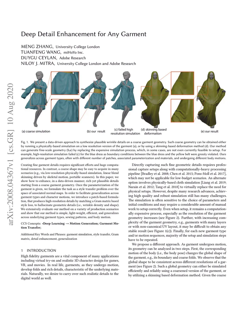Creating fine garment details requires significant efforts and huge computational resources. In contrast, a coarse shape may be easy to acquire in many scenarios (e.g., via low-resolution physically-based simulation, linear blend skinning driven by skeletal motion, portable scanners). In this paper, we show how to enhance, in a data-driven manner, rich yet plausible details starting from a coarse garment geometry. Once the parameterization of the garment is given, we formulate the task as a style transfer problem over the space of associated normal maps. In order to facilitate generalization across garment types and character motions, we introduce a patch-based formulation, that produces high-resolution details by matching a Gram matrix based style loss, to hallucinate geometric details (i.e., wrinkle density and shape). We extensively evaluate our method on a variety of production scenarios and show that our method is simple, light-weight, efficient, and generalizes across underlying garment types, sewing patterns, and body motion.