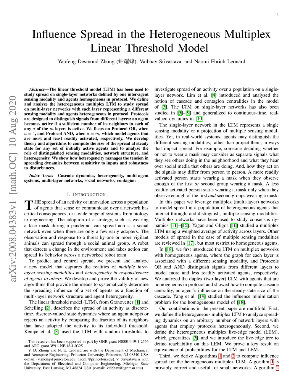 The linear threshold model (LTM) has been used to study spread on single-layer networks defined by one inter-agent sensing modality and agents homogeneous in protocol. We define and analyze the heterogeneous multiplex LTM to study spread on multi-layer networks with each layer representing a different sensing modality and agents heterogeneous in protocol. Protocols are designed to distinguish signals from different layers: an agent becomes active if a sufficient number of its neighbors in each of any of the layers is active. We focus on Protocol OR, when , and Protocol AND, when , which model agents that are most and least readily activated, respectively. We develop theory and algorithms to compute the size of the spread at steady state for any set of initially active agents and to analyze the role of distinguished sensing modalities, network structure, and heterogeneity. We show how heterogeneity manages the tension in spreading dynamics between sensitivity to inputs and robustness to disturbances.