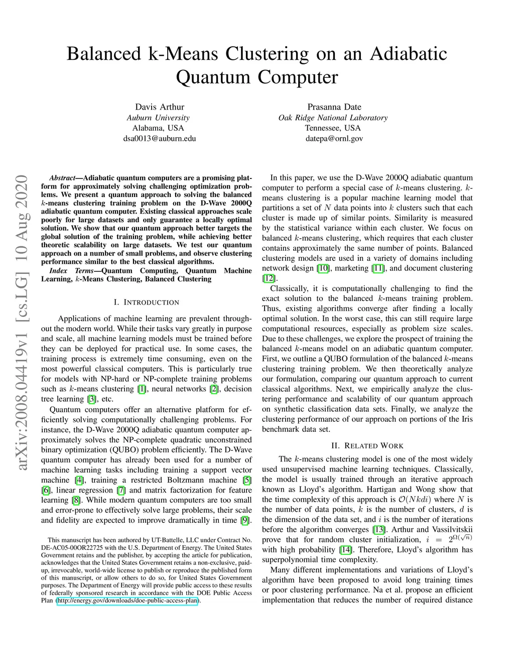 Adiabatic quantum computers are a promising platform for approximately solving challenging optimization problems. We present a quantum approach to solving the balanced -means clustering training problem on the D-Wave 2000Q adiabatic quantum computer. Existing classical approaches scale poorly for large datasets and only guarantee a locally optimal solution. We show that our quantum approach better targets the global solution of the training problem, while achieving better theoretic scalability on large datasets. We test our quantum approach on a number of small problems, and observe clustering performance similar to the best classical algorithms.