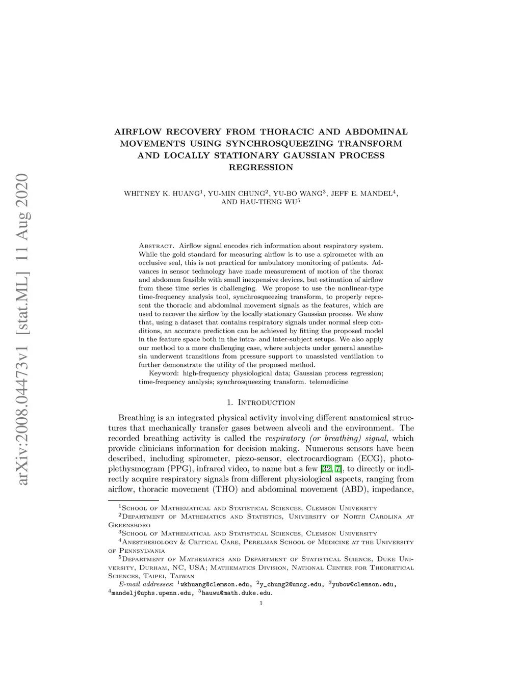 Airflow signal encodes rich information about respiratory system. While the gold standard for measuring airflow is to use a spirometer with an occlusive seal, this is not practical for ambulatory monitoring of patients. Advances in sensor technology have made measurement of motion of the thorax and abdomen feasible with small inexpensive devices, but estimation of airflow from these time series is challenging. We propose to use the nonlinear-type time-frequency analysis tool, synchrosqueezing transform, to properly represent the thoracic and abdominal movement signals as the features, which are used to recover the airflow by the locally stationary Gaussian process. We show that, using a dataset that contains respiratory signals under normal sleep conditions, an accurate prediction can be achieved by fitting the proposed model in the feature space both in the intra- and inter-subject setups. We also apply our method to a more challenging case, where subjects under general anesthesia underwent transitions from pressure support to unassisted ventilation to further demonstrate the utility of the proposed method.