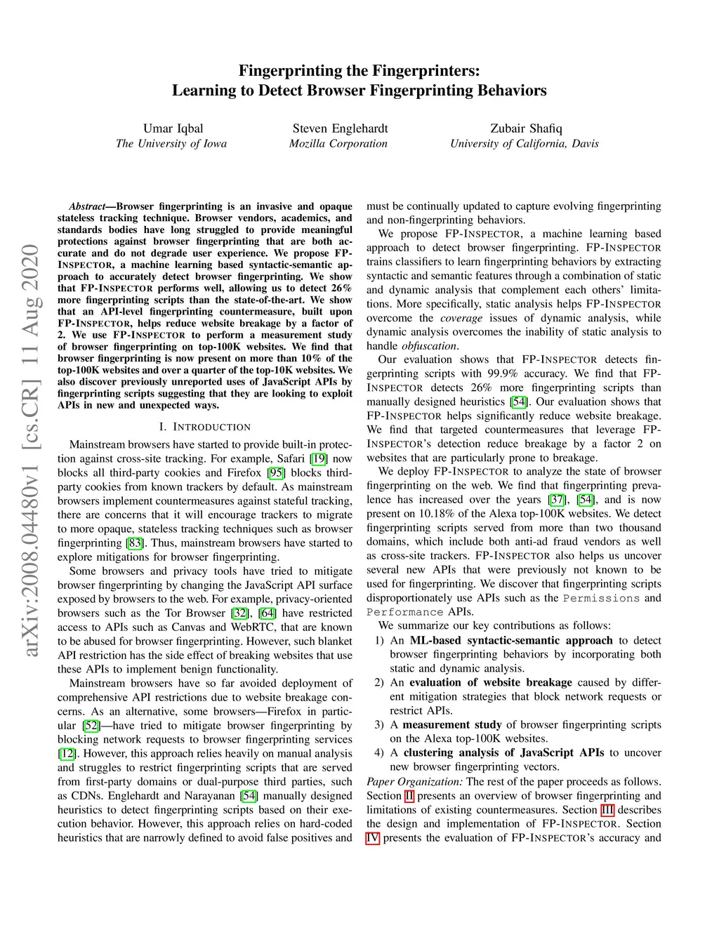 Browser fingerprinting is an invasive and opaque stateless tracking technique. Browser vendors, academics, and standards bodies have long struggled to provide meaningful protections against browser fingerprinting that are both accurate and do not degrade user experience. We propose FP-Inspector, a machine learning based syntactic-semantic approach to accurately detect browser fingerprinting. We show that FP-Inspector performs well, allowing us to detect 26% more fingerprinting scripts than the state-of-the-art. We show that an API-level fingerprinting countermeasure, built upon FP-Inspector, helps reduce website breakage by a factor of 2. We use FP-Inspector to perform a measurement study of browser fingerprinting on top-100K websites. We find that browser fingerprinting is now present on more than 10% of the top-100K websites and over a quarter of the top-10K websites. We also discover previously unreported uses of JavaScript APIs by fingerprinting scripts suggesting that they are looking to exploit APIs in new and unexpected ways.