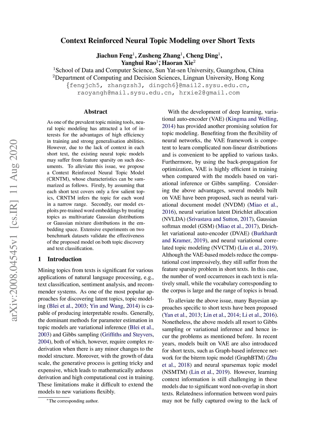 As one of the prevalent topic mining tools, neural topic modeling has attracted a lot of interests for the advantages of high efficiency in training and strong generalisation abilities. However, due to the lack of context in each short text, the existing neural topic models may suffer from feature sparsity on such documents. To alleviate this issue, we propose a Context Reinforced Neural Topic Model (CRNTM), whose characteristics can be summarized as follows. Firstly, by assuming that each short text covers only a few salient topics, CRNTM infers the topic for each word in a narrow range. Secondly, our model exploits pre-trained word embeddings by treating topics as multivariate Gaussian distributions or Gaussian mixture distributions in the embedding space. Extensive experiments on two benchmark datasets validate the effectiveness of the proposed model on both topic discovery and text classification.
