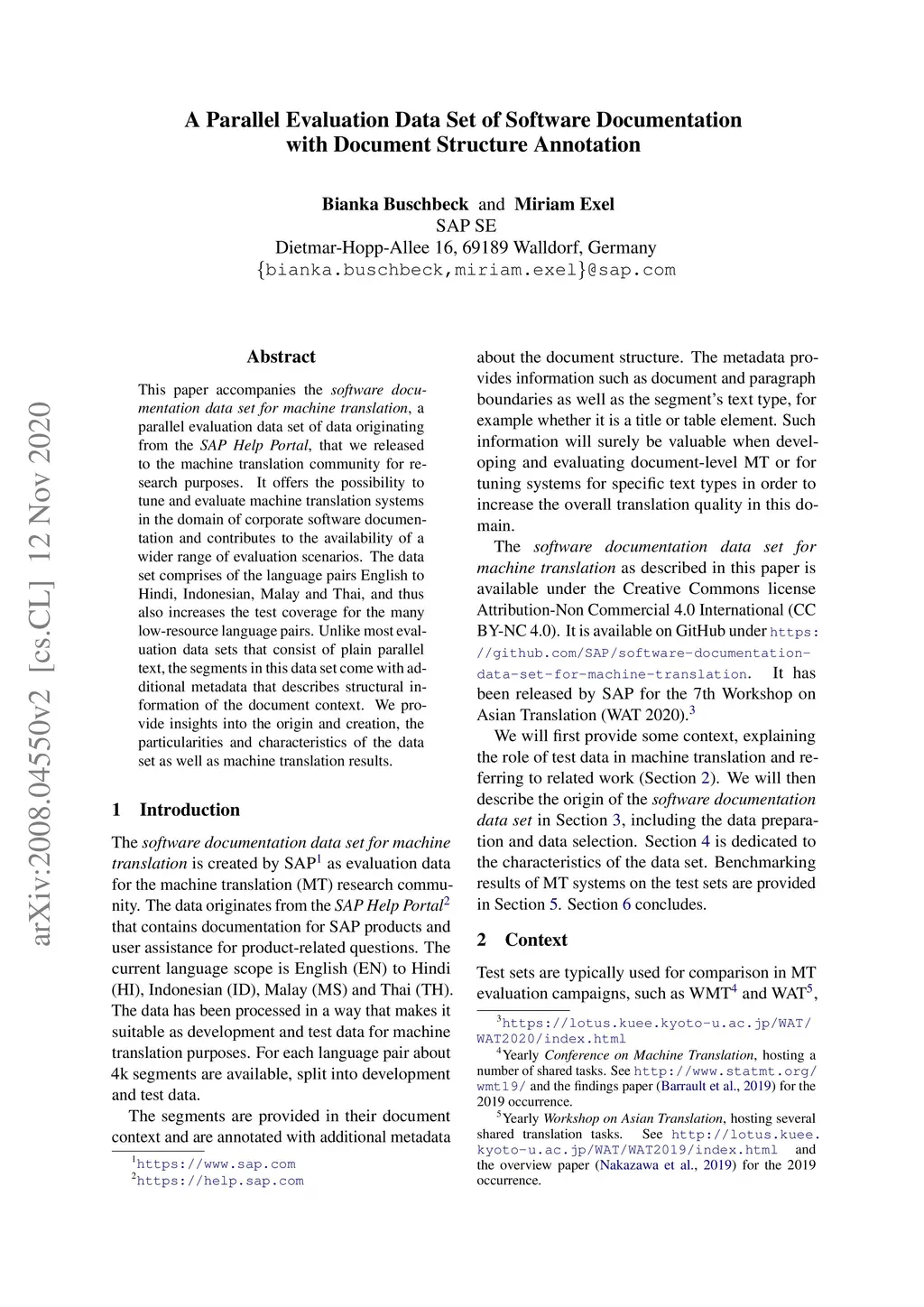 This paper accompanies the software documentation data set for machine translation, a parallel evaluation data set of data originating from the SAP Help Portal, that we released to the machine translation community for research purposes. It offers the possibility to tune and evaluate machine translation systems in the domain of corporate software documentation and contributes to the availability of a wider range of evaluation scenarios. The data set comprises of the language pairs English to Hindi, Indonesian, Malay and Thai, and thus also increases the test coverage for the many low-resource language pairs. Unlike most evaluation data sets that consist of plain parallel text, the segments in this data set come with additional metadata that describes structural information of the document context. We provide insights into the origin and creation, the particularities and characteristics of the data set as well as machine translation results.