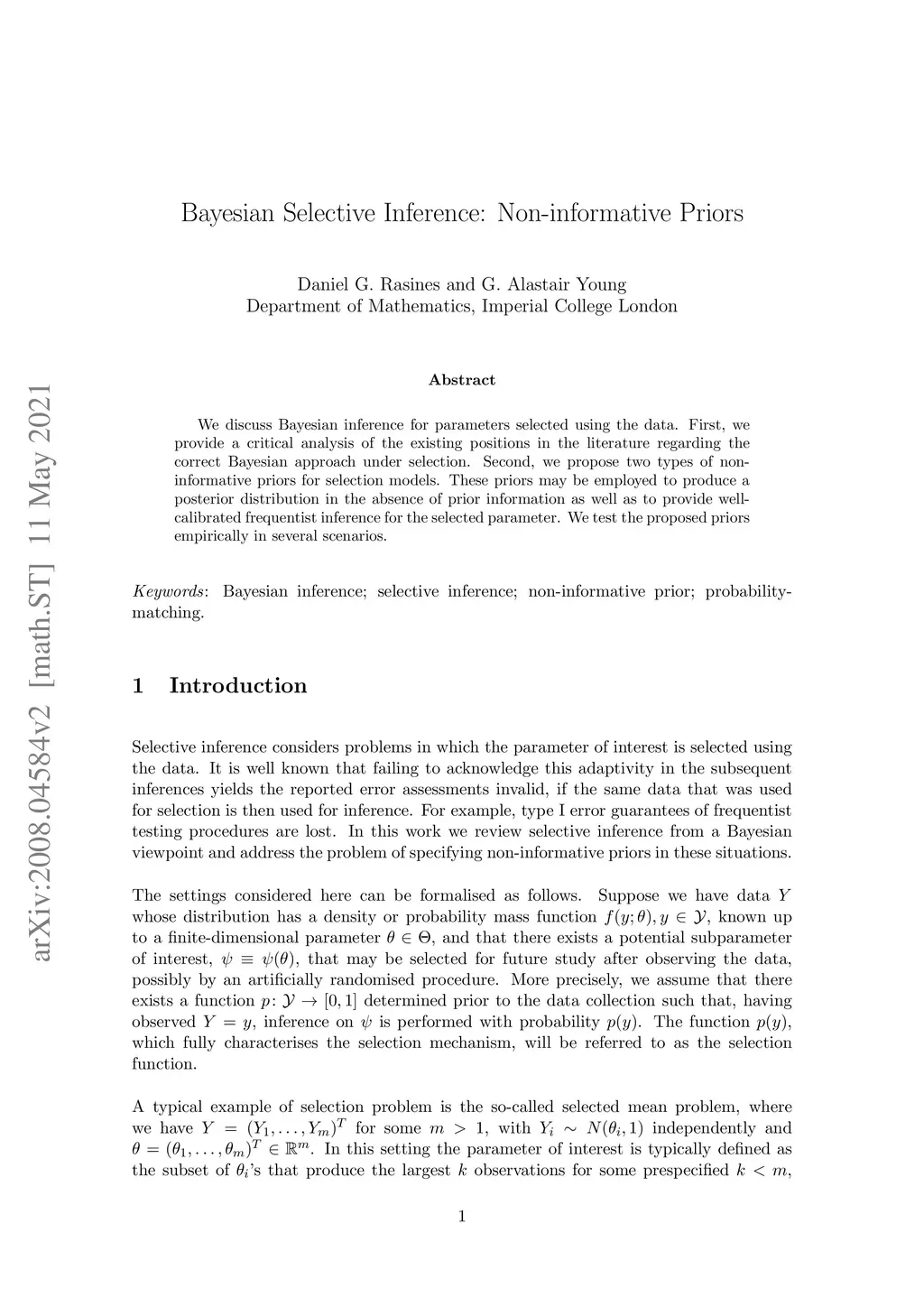 We discuss Bayesian inference for parameters selected using the data. First, we provide a critical analysis of the existing positions in the literature regarding the correct Bayesian approach under selection. Second, we propose two types of non-informative priors for selection models. These priors may be employed to produce a posterior distribution in the absence of prior information as well as to provide well-calibrated frequentist inference for the selected parameter. We test the proposed priors empirically in several scenarios.