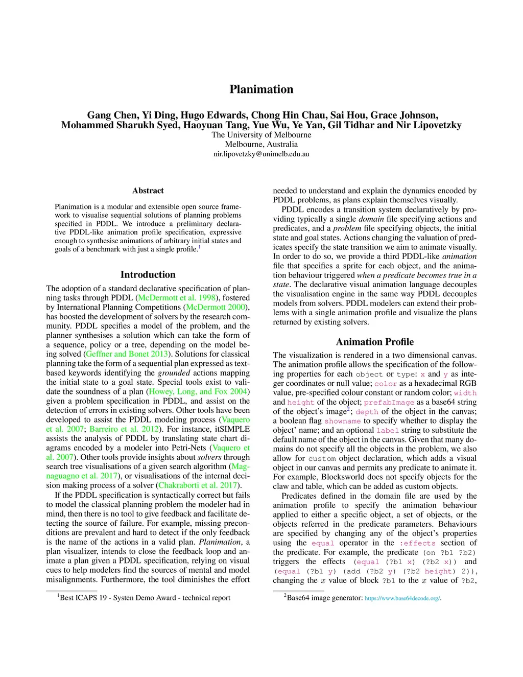 Planimation is a modular and extensible open source framework to visualise sequential solutions of planning problems specified in PDDL. We introduce a preliminary declarative PDDL-like animation profile specification, expressive enough to synthesise animations of arbitrary initial states and goals of a benchmark with just a single profile.