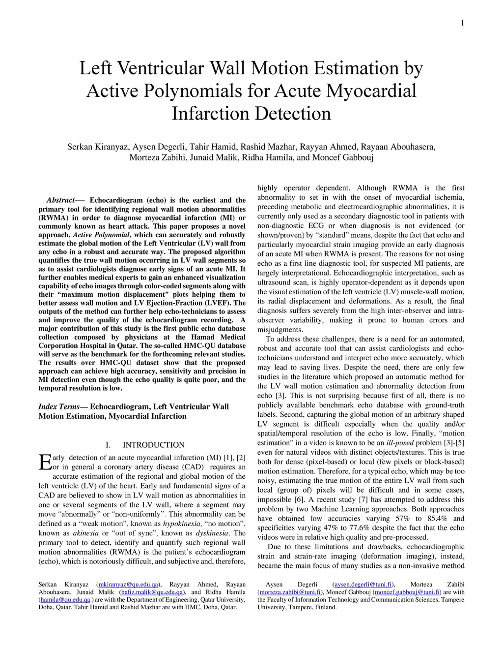 Echocardiogram (echo) is the earliest and the primary tool for identifying regional wall motion abnormalities (RWMA) in order to diagnose myocardial infarction (MI) or commonly known as heart attack. This paper proposes a novel approach, Active Polynomials, which can accurately and robustly estimate the global motion of the Left Ventricular (LV) wall from any echo in a robust and accurate way. The proposed algorithm quantifies the true wall motion occurring in LV wall segments so as to assist cardiologists diagnose early signs of an acute MI. It further enables medical experts to gain an enhanced visualization capability of echo images through color-coded segments along with their "maximum motion displacement" plots helping them to better assess wall motion and LV Ejection-Fraction (LVEF). The outputs of the method can further help echo-technicians to assess and improve the quality of the echocardiogram recording. A major contribution of this study is the first public echo database collection composed by physicians at the Hamad Medical Corporation Hospital in Qatar. The so-called HMC-QU database will serve as the benchmark for the forthcoming relevant studies. The results over the HMC-QU dataset show that the proposed approach can achieve high accuracy, sensitivity and precision in MI detection even though the echo quality is quite poor, and the temporal resolution is low.