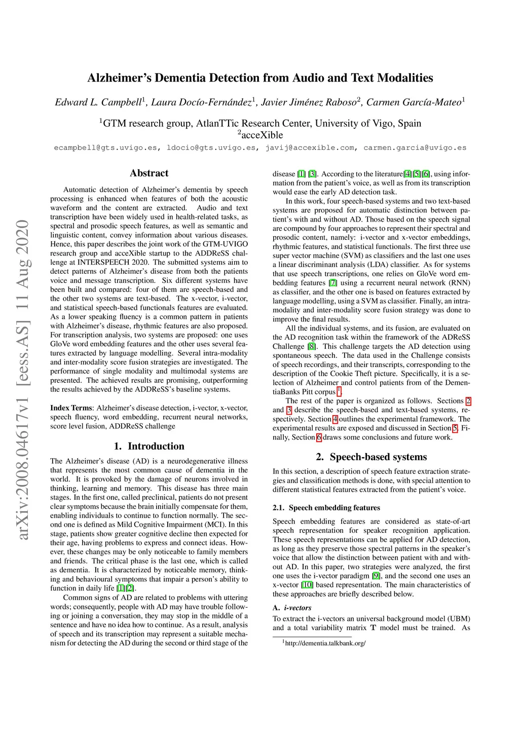 Automatic detection of Alzheimer's dementia by speech processing is enhanced when features of both the acoustic waveform and the content are extracted. Audio and text transcription have been widely used in health-related tasks, as spectral and prosodic speech features, as well as semantic and linguistic content, convey information about various diseases. Hence, this paper describes the joint work of the GTM-UVIGO research group and acceXible startup to the ADDReSS challenge at INTERSPEECH 2020. The submitted systems aim to detect patterns of Alzheimer's disease from both the patient's voice and message transcription. Six different systems have been built and compared: four of them are speech-based and the other two systems are text-based. The x-vector, i-vector, and statistical speech-based functionals features are evaluated. As a lower speaking fluency is a common pattern in patients with Alzheimer's disease, rhythmic features are also proposed. For transcription analysis, two systems are proposed: one uses GloVe word embedding features and the other uses several features extracted by language modelling. Several intra-modality and inter-modality score fusion strategies are investigated. The performance of single modality and multimodal systems are presented. The achieved results are promising, outperforming the results achieved by the ADDReSS's baseline systems.