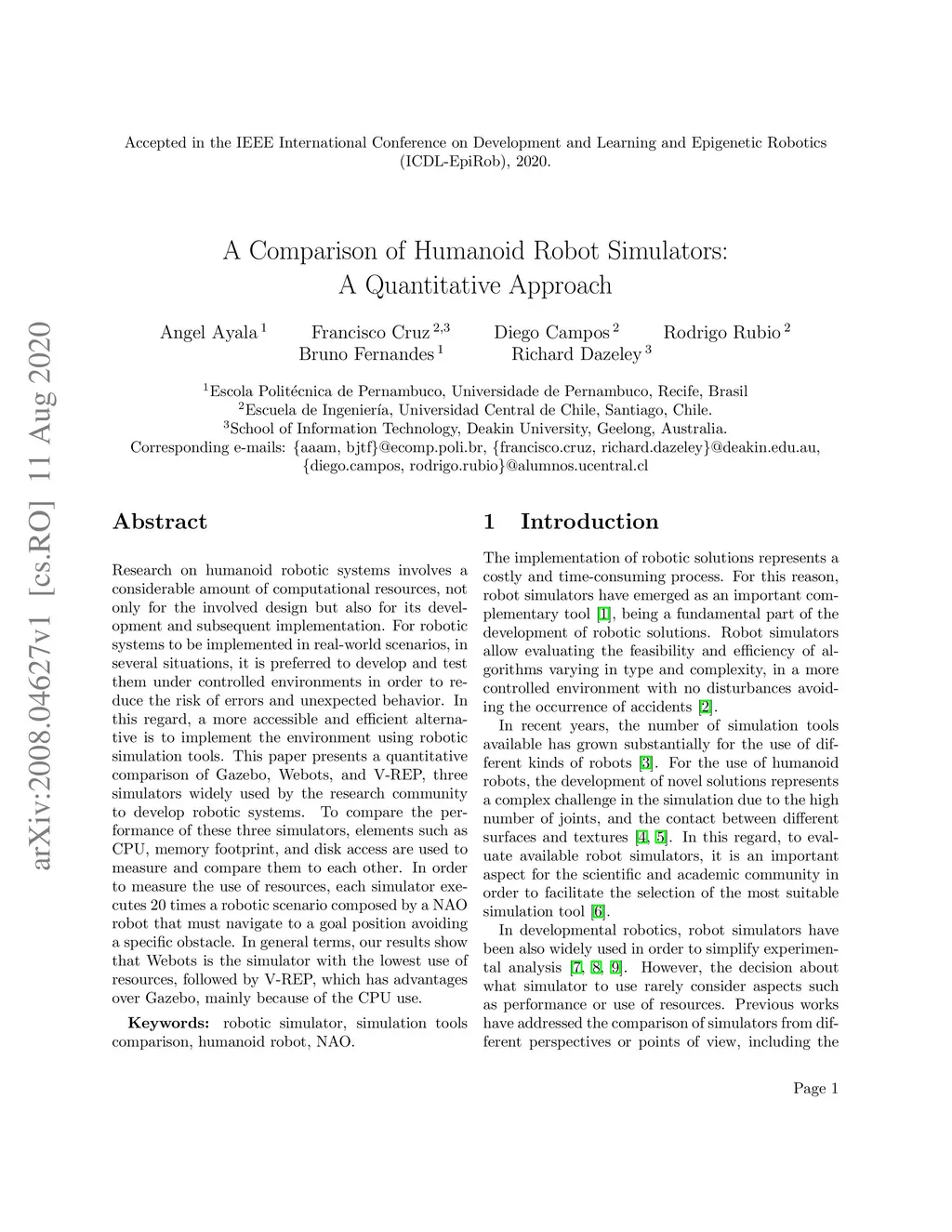Research on humanoid robotic systems involves a considerable amount of computational resources, not only for the involved design but also for its development and subsequent implementation. For robotic systems to be implemented in real-world scenarios, in several situations, it is preferred to develop and test them under controlled environments in order to reduce the risk of errors and unexpected behavior. In this regard, a more accessible and efficient alternative is to implement the environment using robotic simulation tools. This paper presents a quantitative comparison of Gazebo, Webots, and V-REP, three simulators widely used by the research community to develop robotic systems. To compare the performance of these three simulators, elements such as CPU, memory footprint, and disk access are used to measure and compare them to each other. In order to measure the use of resources, each simulator executes 20 times a robotic scenario composed by a NAO robot that must navigate to a goal position avoiding a specific obstacle. In general terms, our results show that Webots is the simulator with the lowest use of resources, followed by V-REP, which has advantages over Gazebo, mainly because of the CPU use.