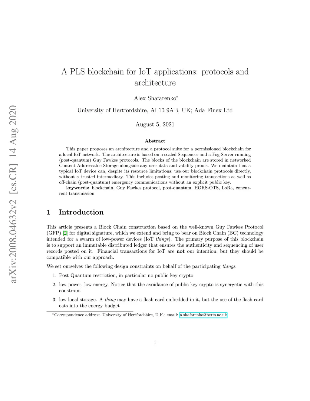 This paper proposes an architecture and a protocol suite for a permissioned blockchain for a local IoT network. The architecture is based on a sealed Sequencer and a Fog Server running (post-quantum) Guy Fawkes protocols. The blocks of the blockchain are stored in networked Content Addressable Storage alongside any user data and validity proofs. We maintain that a typical IoT device can, despite its resource limitations, use our blockchain protocols directly, without a trusted intermediary. This includes posting and monitoring transactions as well as off-chain (post-quantum) emergency communications without an explicit public key. Keywords: blockchain, Guy Fawkes protocol, post-quantum, HORS-OTS, LoRa, concurrent transmission