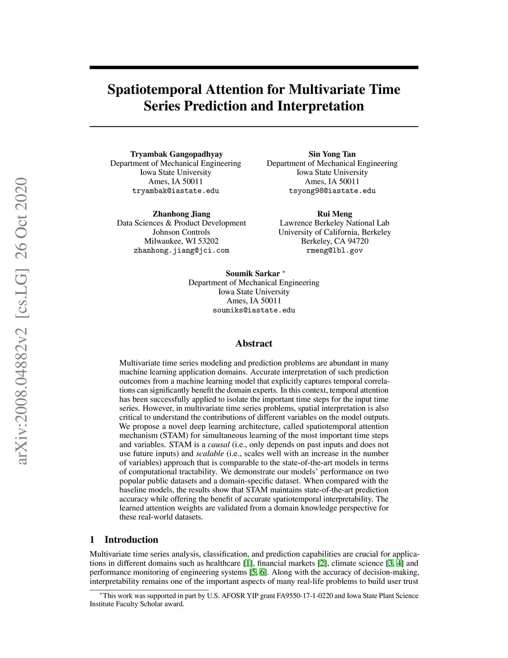 Multivariate time series modeling and prediction problems are abundant in many machine learning application domains. Accurate interpretation of such prediction outcomes from a machine learning model that explicitly captures temporal correlations can significantly benefit the domain experts. In this context, temporal attention has been successfully applied to isolate the important time steps for the input time series. However, in multivariate time series problems, spatial interpretation is also critical to understand the contributions of different variables on the model outputs. We propose a novel deep learning architecture, called spatiotemporal attention mechanism (STAM) for simultaneous learning of the most important time steps and variables. STAM is a causal (i.e., only depends on past inputs and does not use future inputs) and scalable (i.e., scales well with an increase in the number of variables) approach that is comparable to the state-of-the-art models in terms of computational tractability. We demonstrate our models' performance on two popular public datasets and a domain-specific dataset. When compared with the baseline models, the results show that STAM maintains state-of-the-art prediction accuracy while offering the benefit of accurate spatiotemporal interpretability. The learned attention weights are validated from a domain knowledge perspective for these real-world datasets.