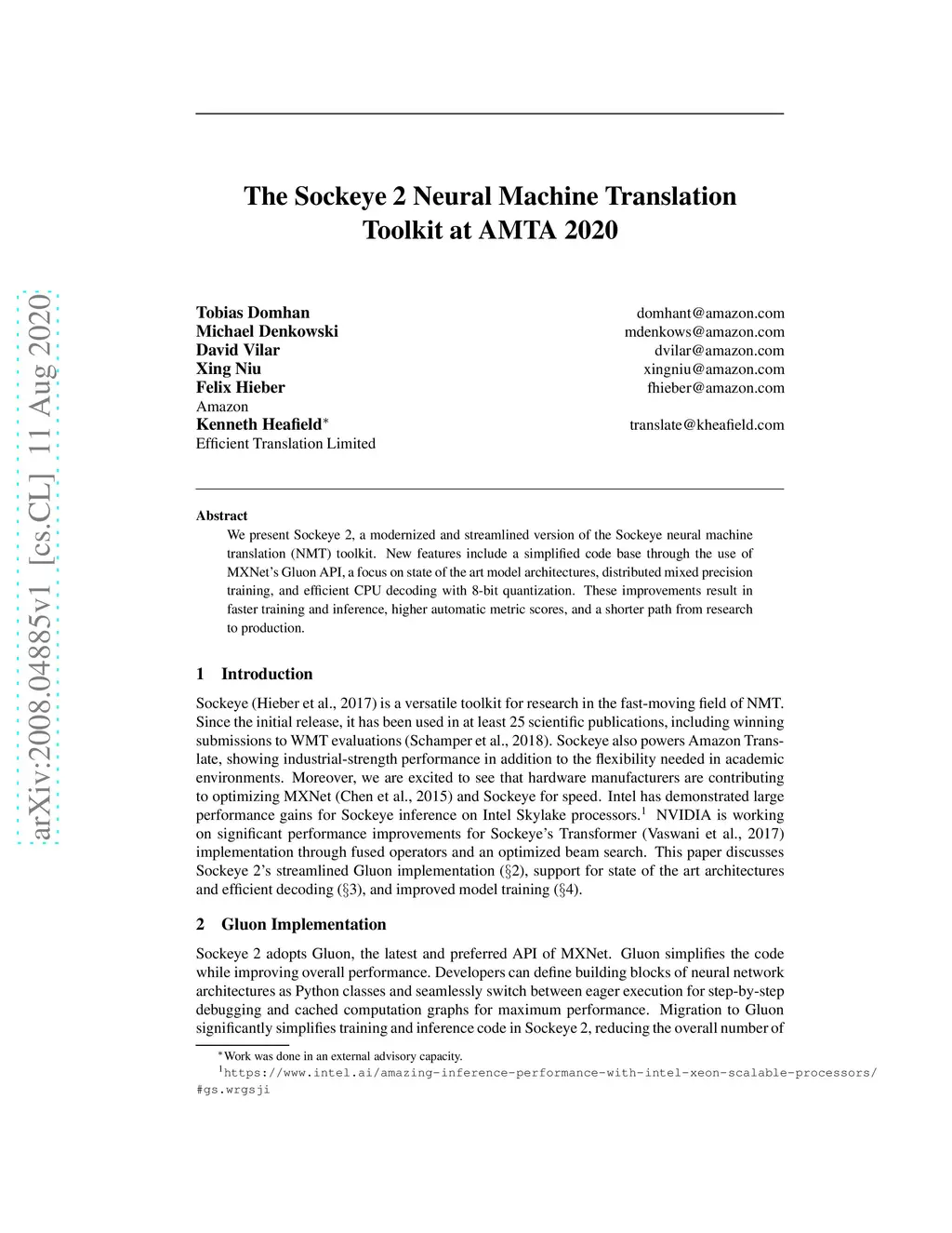 The Sockeye 2 Neural Machine Translation Toolkit at AMTA 2020