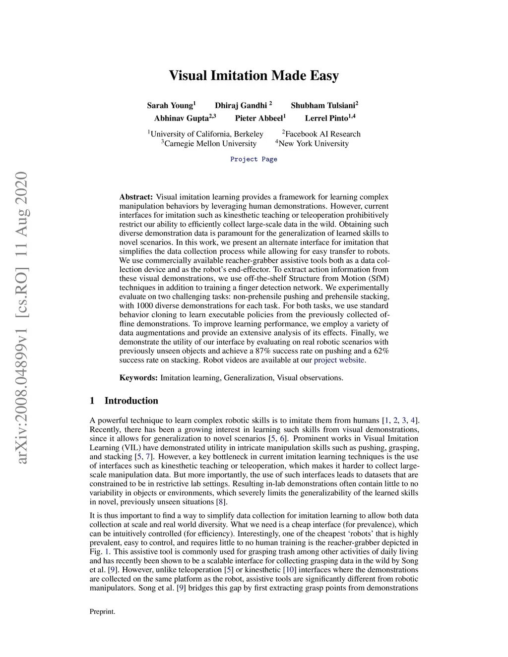 Visual imitation learning provides a framework for learning complex manipulation behaviors by leveraging human demonstrations. However, current interfaces for imitation such as kinesthetic teaching or teleoperation prohibitively restrict our ability to efficiently collect large-scale data in the wild. Obtaining such diverse demonstration data is paramount for the generalization of learned skills to novel scenarios. In this work, we present an alternate interface for imitation that simplifies the data collection process while allowing for easy transfer to robots. We use commercially available reacher-grabber assistive tools both as a data collection device and as the robot's end-effector. To extract action information from these visual demonstrations, we use off-the-shelf Structure from Motion (SfM) techniques in addition to training a finger detection network. We experimentally evaluate on two challenging tasks: non-prehensile pushing and prehensile stacking, with 1000 diverse demonstrations for each task. For both tasks, we use standard behavior cloning to learn executable policies from the previously collected offline demonstrations. To improve learning performance, we employ a variety of data augmentations and provide an extensive analysis of its effects. Finally, we demonstrate the utility of our interface by evaluating on real robotic scenarios with previously unseen objects and achieve a 87% success rate on pushing and a 62% success rate on stacking. Robot videos are available at https://dhiraj100892.github.io/Visual-Imitation-Made-Easy.