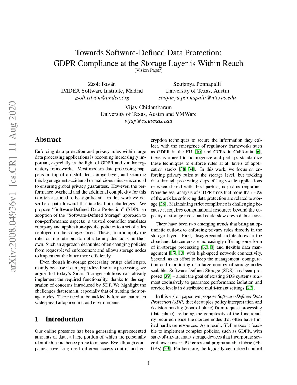 Enforcing data protection and privacy rules within large data processing applications is becoming increasingly important, especially in the light of GDPR and similar regulatory frameworks. Most modern data processing happens on top of a distributed storage layer, and securing this layer against accidental or malicious misuse is crucial to ensuring global privacy guarantees. However, the performance overhead and the additional complexity for this is often assumed to be significant -- in this work we describe a path forward that tackles both challenges. We propose "Software-Defined Data Protection" (SDP), an adoption of the "Software-Defined Storage" approach to non-performance aspects: a trusted controller translates company and application-specific policies to a set of rules deployed on the storage nodes. These, in turn, apply the rules at line-rate but do not take any decisions on their own. Such an approach decouples often changing policies from request-level enforcement and allows storage nodes to implement the latter more efficiently. Even though in-storage processing brings challenges, mainly because it can jeopardize line-rate processing, we argue that today's Smart Storage solutions can already implement the required functionality, thanks to the separation of concerns introduced by SDP. We highlight the challenges that remain, especially that of trusting the storage nodes. These need to be tackled before we can reach widespread adoption in cloud environments.