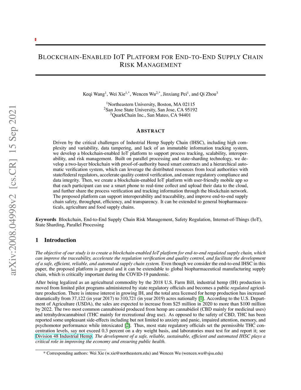 After being legalized as an agricultural commodity by the 2018 U.S. Farm Bill, the Industrial Hemp production is moved from limited pilot programs to a regulated agriculture production system, and the market keeps increasing since then. However, Industrial Hemp Supply Chain (IHSC) faces several critical challenges, including high complexity and variability, data tampering, and lack of immutable information tracking system. In this paper, we develop a blockchain enabled internet-of-things (IoT) platform for IHSC to support process tracking, scalability, interoperability, and risk management. Basically, we create a two-layer blockchain with proof-of-authority based smart contract, which can leverage local authorities with state/federal regulators to ensure and accelerate quality control verification and regulatory compliance. Then, we develop a user-friendly mobile app so that each participant can use smart phone to real-time collect and upload their data to the cloud, and further share the process verification and tracking information through the blockchain network. Our study indicates the proposed platform can support interoperability, improve the efficiency of quality control verification, and ensure the safety of regulated IHSC.