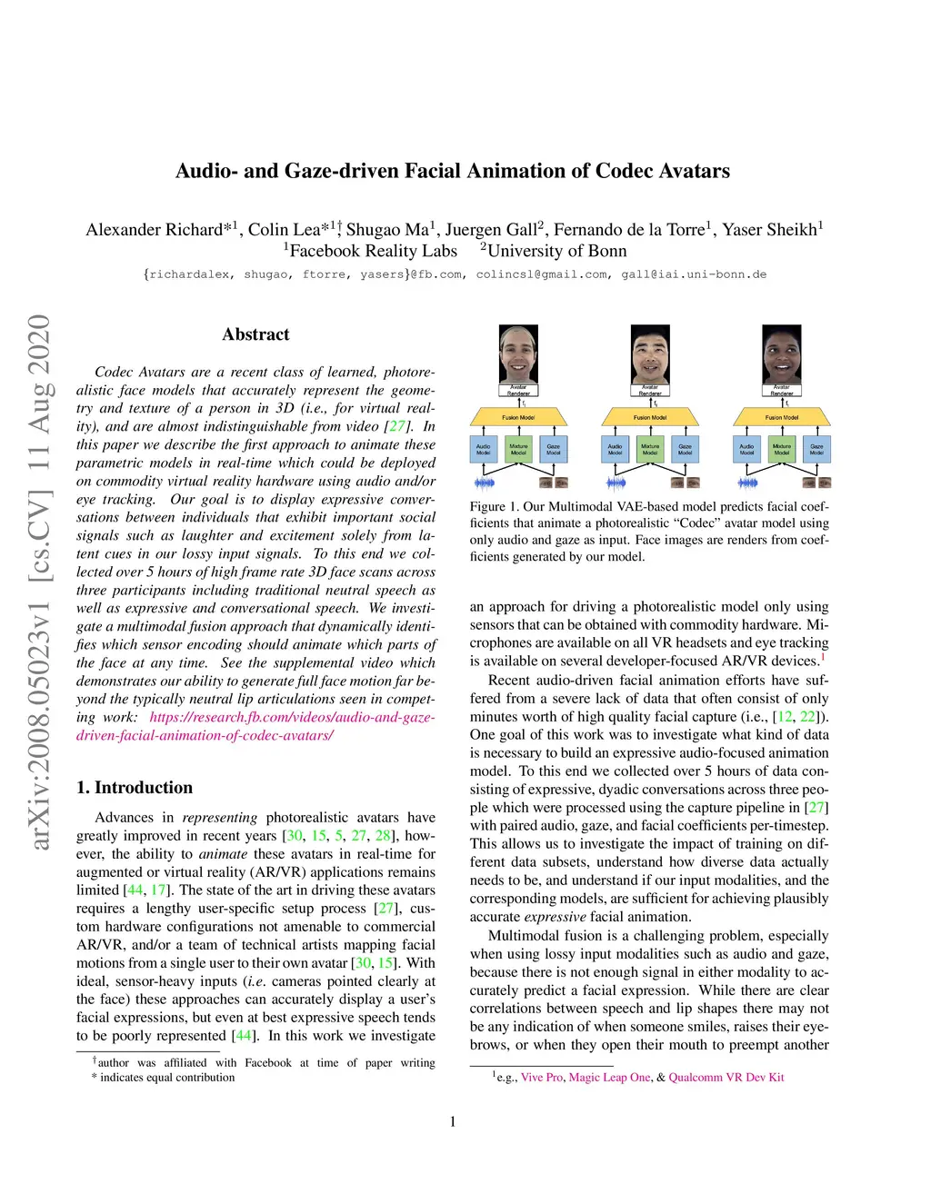 Codec Avatars are a recent class of learned, photorealistic face models that accurately represent the geometry and texture of a person in 3D (i.e., for virtual reality), and are almost indistinguishable from video. In this paper we describe the first approach to animate these parametric models in real-time which could be deployed on commodity virtual reality hardware using audio and/or eye tracking. Our goal is to display expressive conversations between individuals that exhibit important social signals such as laughter and excitement solely from latent cues in our lossy input signals. To this end we collected over 5 hours of high frame rate 3D face scans across three participants including traditional neutral speech as well as expressive and conversational speech. We investigate a multimodal fusion approach that dynamically identifies which sensor encoding should animate which parts of the face at any time. See the supplemental video which demonstrates our ability to generate full face motion far beyond the typically neutral lip articulations seen in competing work: https://research.fb.com/videos/audio-and-gaze-driven-facial-animation-of-codec-avatars/