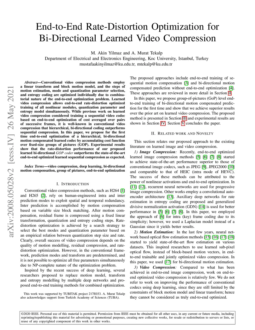 Conventional video compression methods employ a linear transform and block motion model, and the steps of motion estimation, mode and quantization parameter selection, and entropy coding are optimized individually due to combinatorial nature of the end-to-end optimization problem. Learned video compression allows end-to-end rate-distortion optimized training of all nonlinear modules, quantization parameter and entropy model simultaneously. While previous work on learned video compression considered training a sequential video codec based on end-to-end optimization of cost averaged over pairs of successive frames, it is well-known in conventional video compression that hierarchical, bi-directional coding outperforms sequential compression. In this paper, we propose for the first time end-to-end optimization of a hierarchical, bi-directional motion compensated learned codec by accumulating cost function over fixed-size groups of pictures (GOP). Experimental results show that the rate-distortion performance of our proposed learned bi-directional {\it GOP coder} outperforms the state-of-the-art end-to-end optimized learned sequential compression as expected.