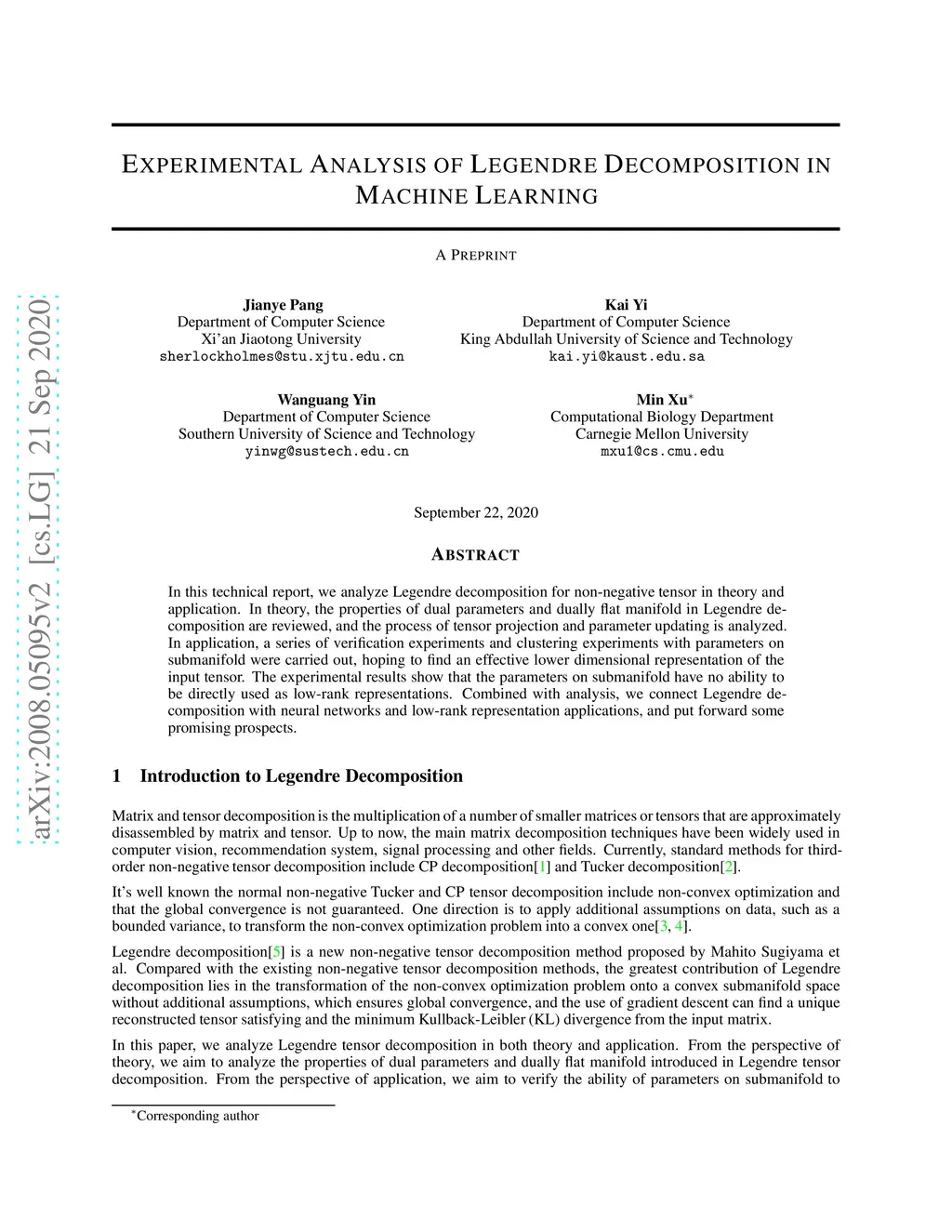 In this technical report, we analyze Legendre decomposition for non-negative tensor in theory and application. In theory, the properties of dual parameters and dually flat manifold in Legendre decomposition are reviewed, and the process of tensor projection and parameter updating is analyzed. In application, a series of verification experiments and clustering experiments with parameters on submanifold were carried out, hoping to find an effective lower dimensional representation of the input tensor. The experimental results show that the parameters on submanifold have no ability to be directly used as low-rank representations. Combined with analysis, we connect Legendre decomposition with neural networks and low-rank representation applications, and put forward some promising prospects.
