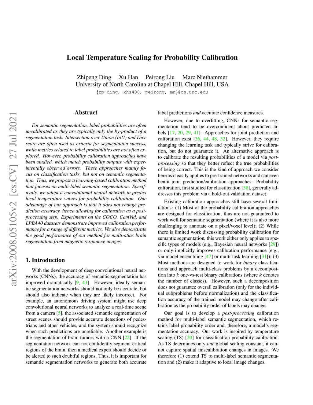 For semantic segmentation, label probabilities are often uncalibrated as they are typically only the by-product of a segmentation task. Intersection over Union (IoU) and Dice score are often used as criteria for segmentation success, while metrics related to label probabilities are not often explored. However, probability calibration approaches have been studied, which match probability outputs with experimentally observed errors. These approaches mainly focus on classification tasks, but not on semantic segmentation. Thus, we propose a learning-based calibration method that focuses on multi-label semantic segmentation. Specifically, we adopt a convolutional neural network to predict local temperature values for probability calibration. One advantage of our approach is that it does not change prediction accuracy, hence allowing for calibration as a post-processing step. Experiments on the COCO, CamVid, and LPBA40 datasets demonstrate improved calibration performance for a range of different metrics. We also demonstrate the good performance of our method for multi-atlas brain segmentation from magnetic resonance images.