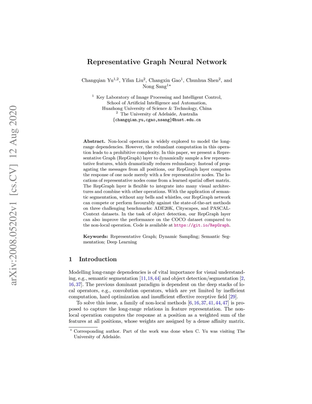 Non-local operation is widely explored to model the long-range dependencies. However, the redundant computation in this operation leads to a prohibitive complexity. In this paper, we present a Representative Graph (RepGraph) layer to dynamically sample a few representative features, which dramatically reduces redundancy. Instead of propagating the messages from all positions, our RepGraph layer computes the response of one node merely with a few representative nodes. The locations of representative nodes come from a learned spatial offset matrix. The RepGraph layer is flexible to integrate into many visual architectures and combine with other operations. With the application of semantic segmentation, without any bells and whistles, our RepGraph network can compete or perform favourably against the state-of-the-art methods on three challenging benchmarks: ADE20K, Cityscapes, and PASCAL-Context datasets. In the task of object detection, our RepGraph layer can also improve the performance on the COCO dataset compared to the non-local operation. Code is available at https://git.io/RepGraph.