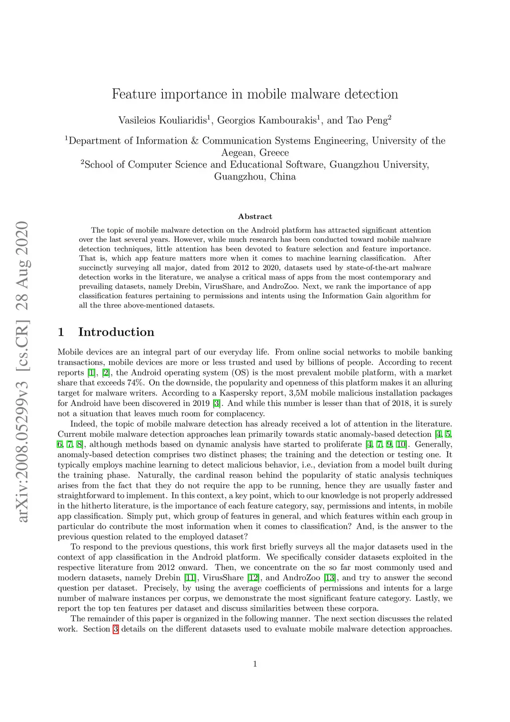 The topic of mobile malware detection on the Android platform has attracted significant attention over the last several years. However, while much research has been conducted toward mobile malware detection techniques, little attention has been devoted to feature selection and feature importance. That is, which app feature matters more when it comes to machine learning classification. After succinctly surveying all major, dated from 2012 to 2020, datasets used by state-of-the-art malware detection works in the literature, we analyse a critical mass of apps from the most contemporary and prevailing datasets, namely Drebin, VirusShare, and AndroZoo. Next, we rank the importance of app classification features pertaining to permissions and intents using the Information Gain algorithm for all the three above-mentioned datasets.