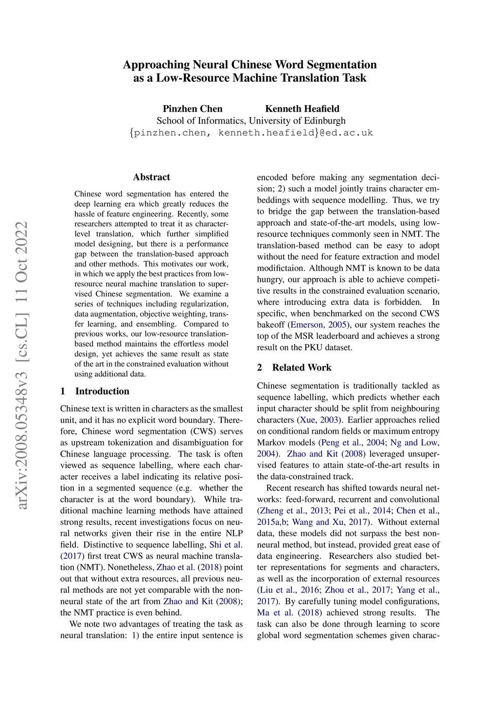 Approaching Neural Chinese Word Segmentation as a Low-Resource Machine