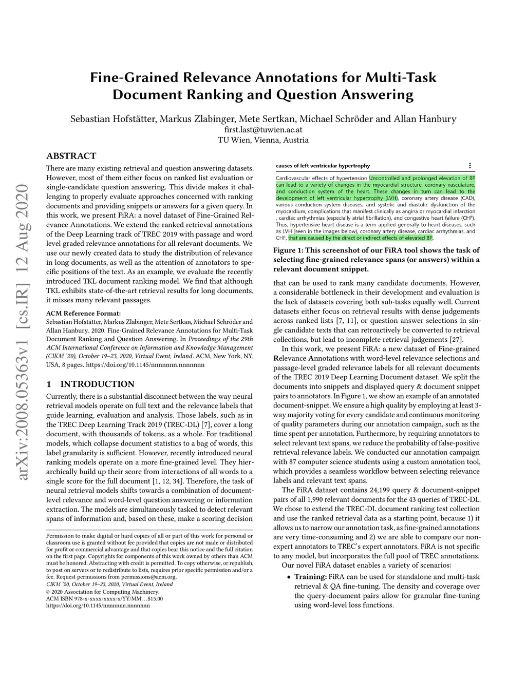 There are many existing retrieval and question answering datasets. However, most of them either focus on ranked list evaluation or single-candidate question answering. This divide makes it challenging to properly evaluate approaches concerned with ranking documents and providing snippets or answers for a given query. In this work, we present FiRA: a novel dataset of Fine-Grained Relevance Annotations. We extend the ranked retrieval annotations of the Deep Learning track of TREC 2019 with passage and word level graded relevance annotations for all relevant documents. We use our newly created data to study the distribution of relevance in long documents, as well as the attention of annotators to specific positions of the text. As an example, we evaluate the recently introduced TKL document ranking model. We find that although TKL exhibits state-of-the-art retrieval results for long documents, it misses many relevant passages.